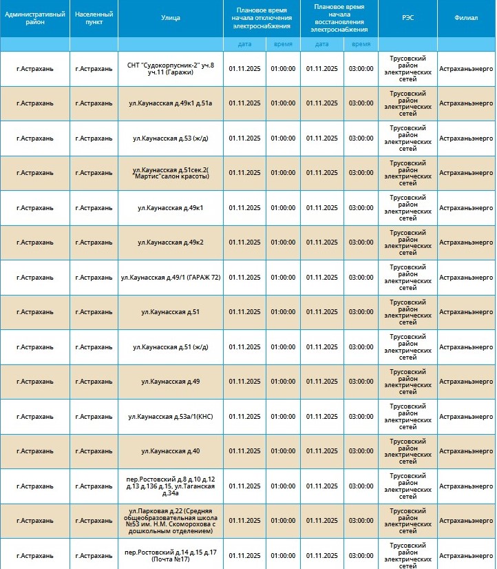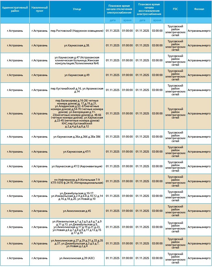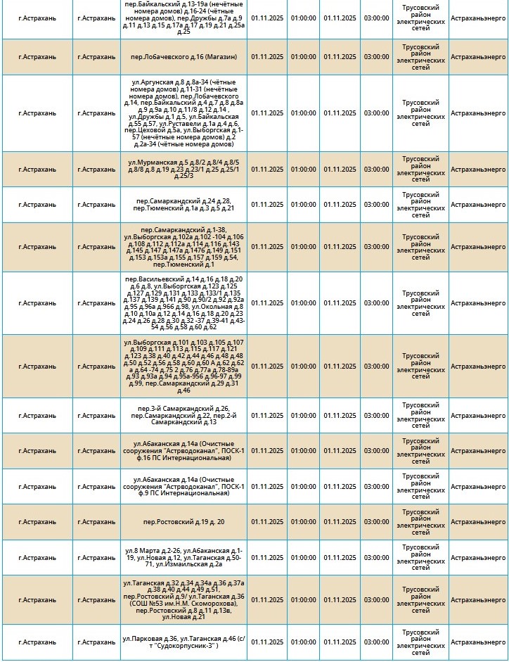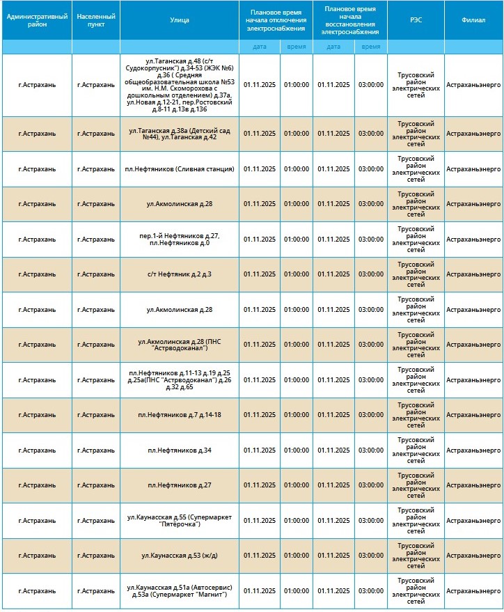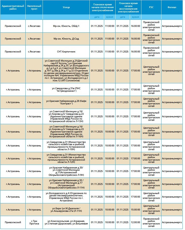 Подача ресурса приостановится на десятках улицах Астрахани. А также ряда сел Приволжского, Икрянинского и Ахтубинского районов. Адреса смотрите в таблице ниже.