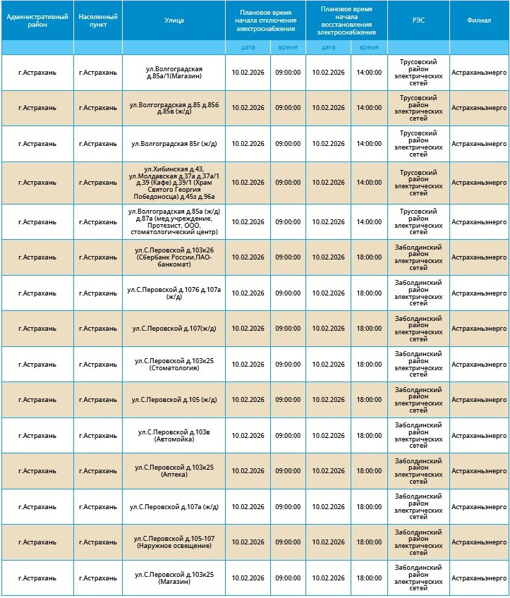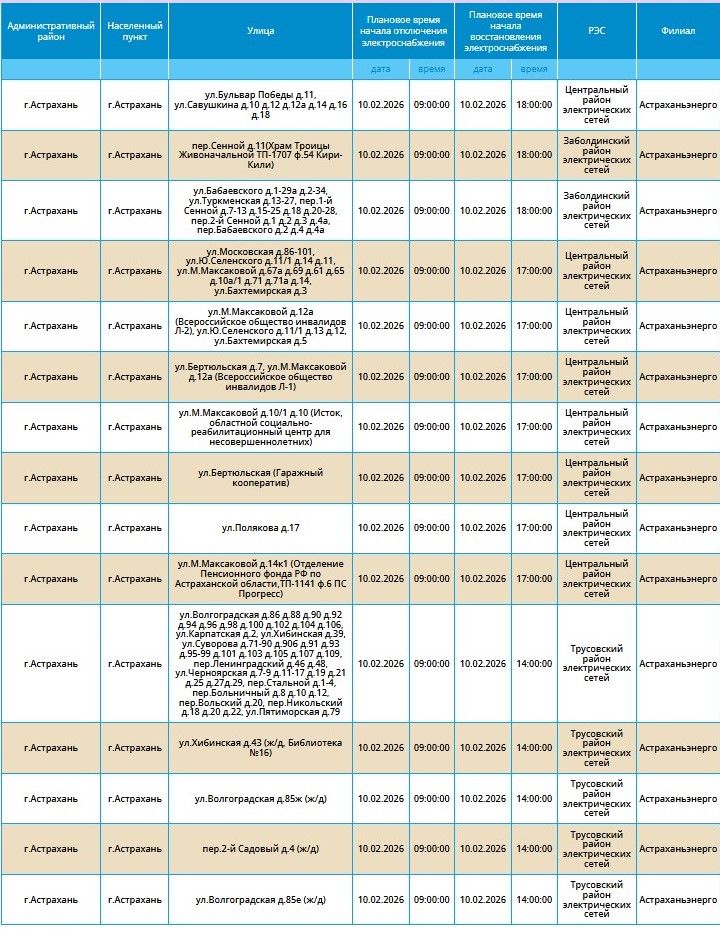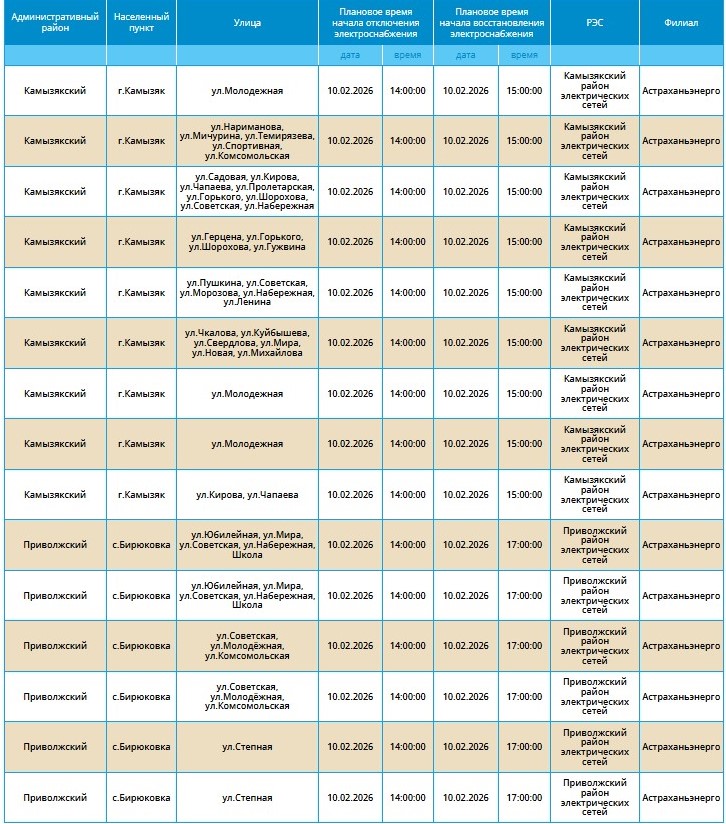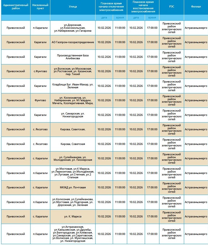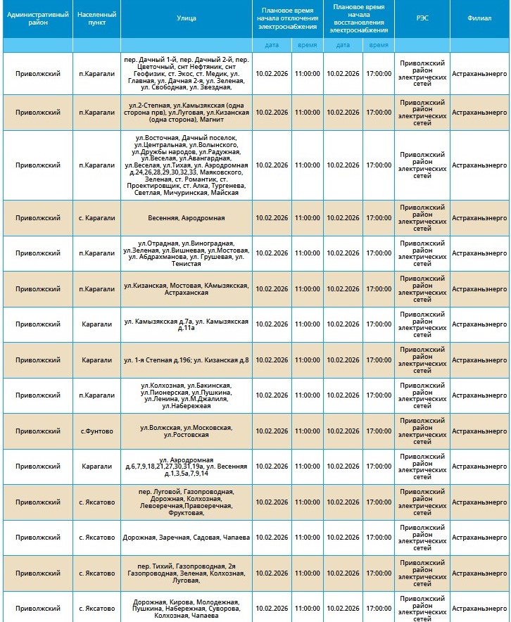 Массовые перебои в электроснабжении продолжатся и во вторник. 10 февраля отключат электричество в ряде населенных пунктов Астраханской области. Расскажем, какие из них попали в число «счастливчиков».