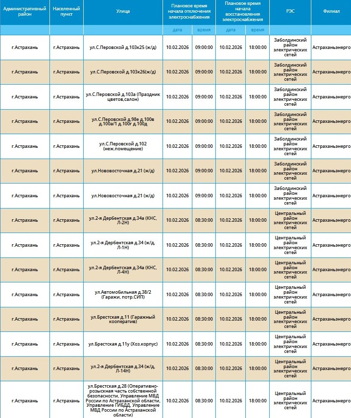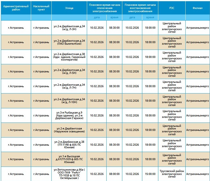10 февраля массово отключат электричество в Астрахани и двух районах