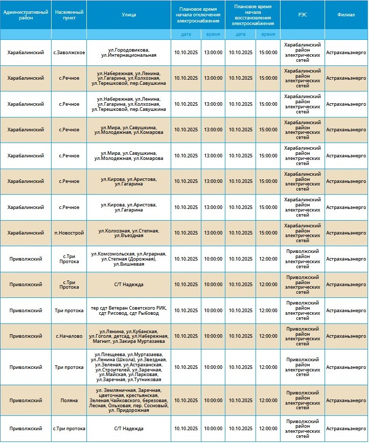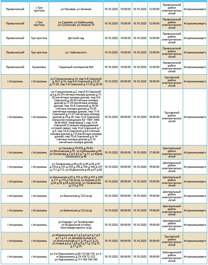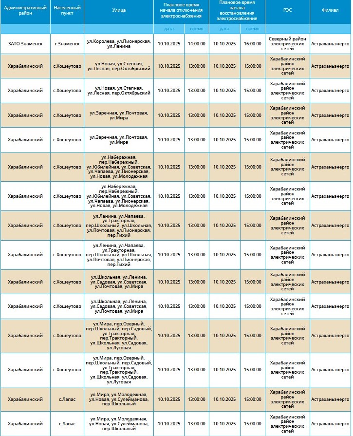 Массовые перебои в электроснабжении продолжатся и в пятницу. 10 октября отключение света коснется нескольких населенных пунктов Астраханской области. Astrakhanpost.ru выяснил, какие из них попали в список «счастливчиков».