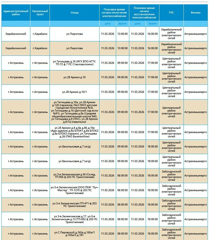 Массовые перебои в электроснабжении продолжатся и в среду. 11 марта отключат свет в двух населенных пунктах Астраханской области.