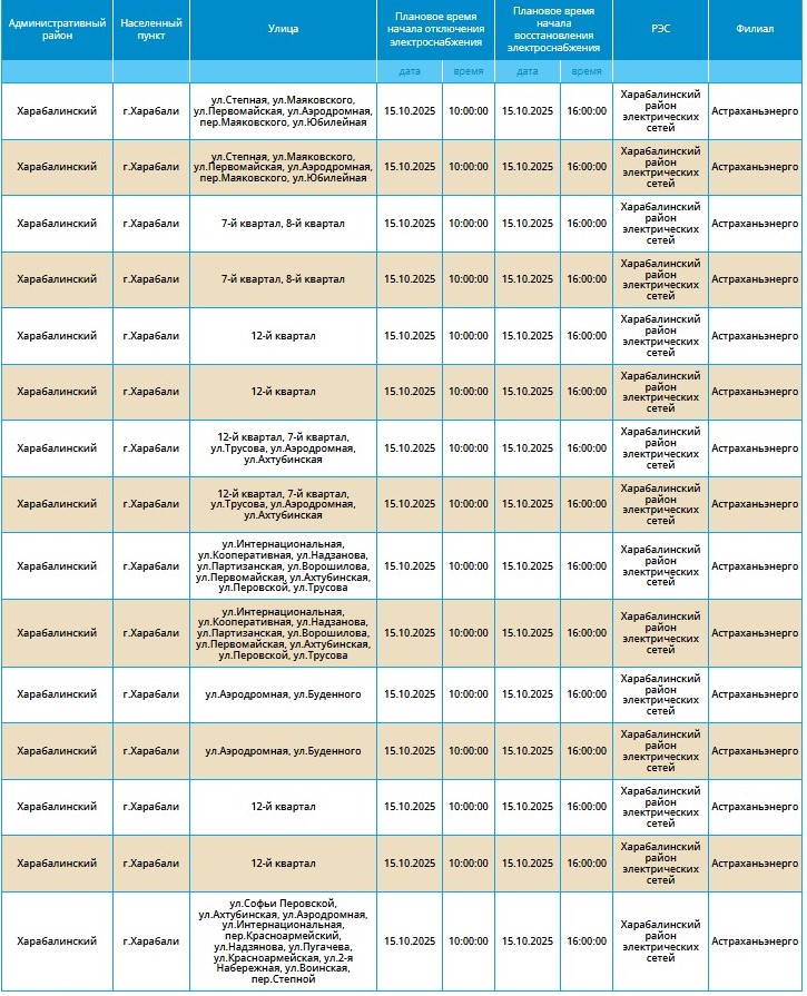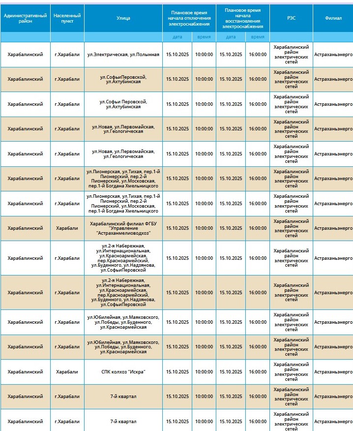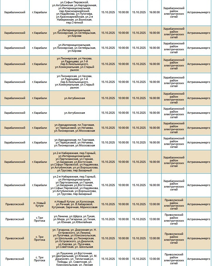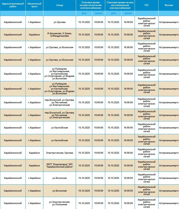 В Астрахани без электричества останутся 20 улиц. Также электропауза наступит по нескольким улицам города Харабали, а также пяти сел и поселков Ахтубинского и Приволжского районов. Адреса смотрите в таблице ниже.