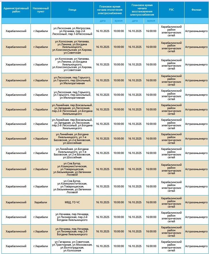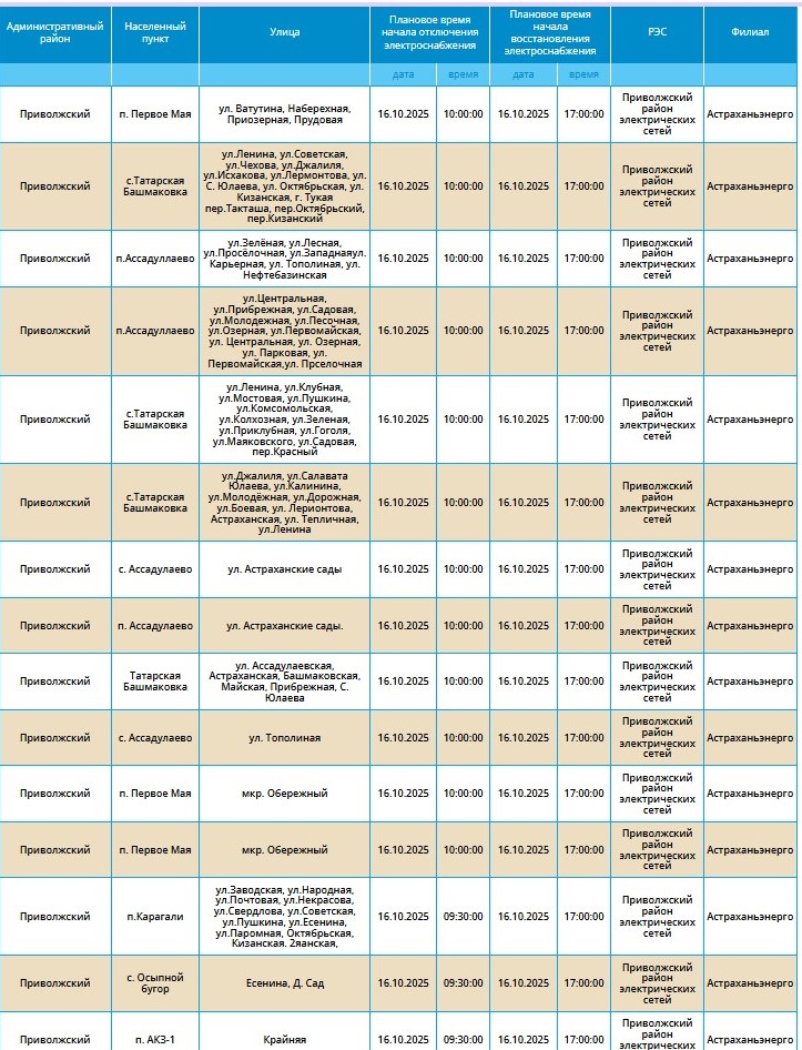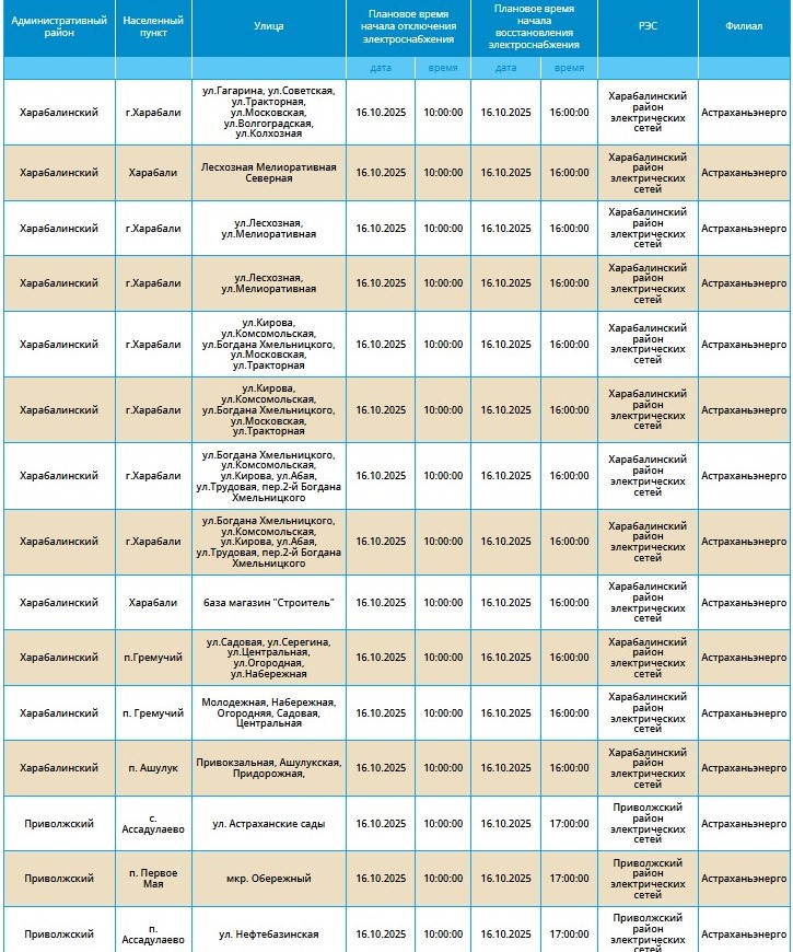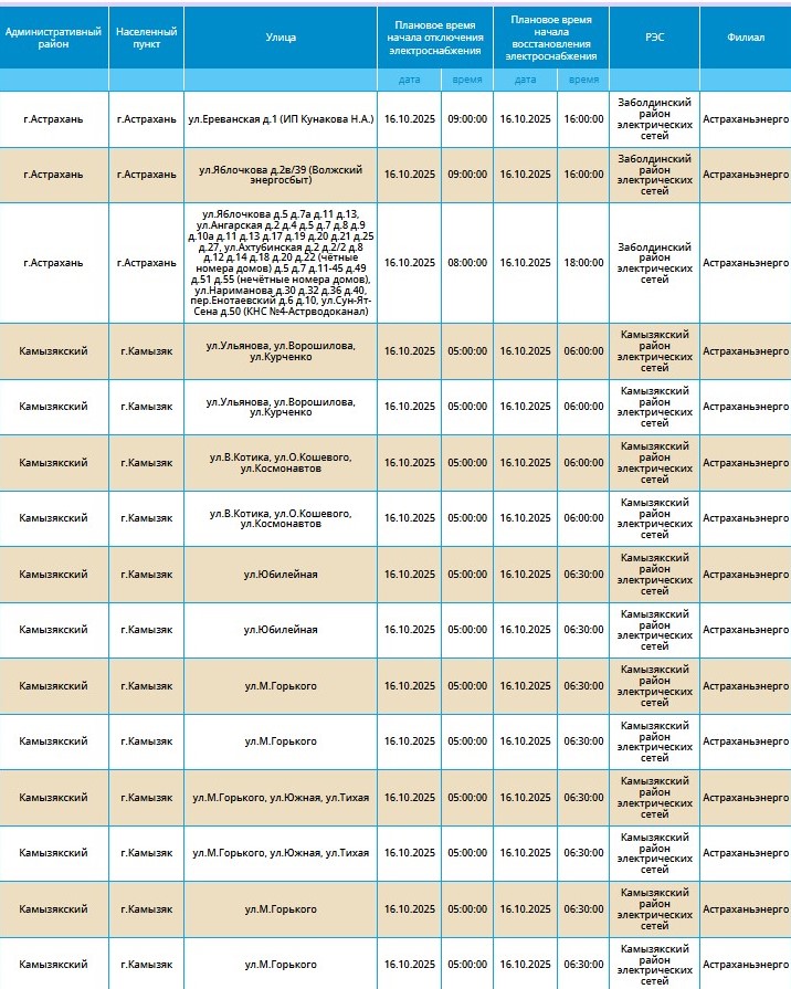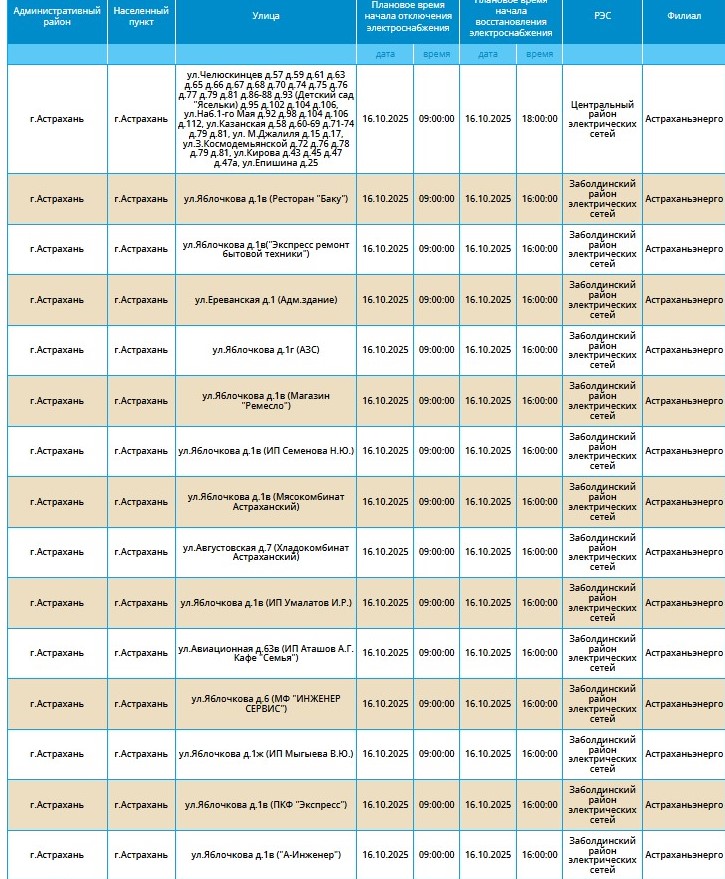 Массовые перебои в электроснабжении продолжатся и в четверг. 16 октября отключение света коснется ряда населенных пунктов Астраханской области. Astrakhanpost.ru выяснил, какие из них вошли в число «счастливчиков».