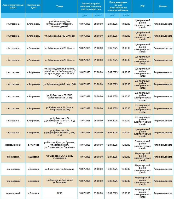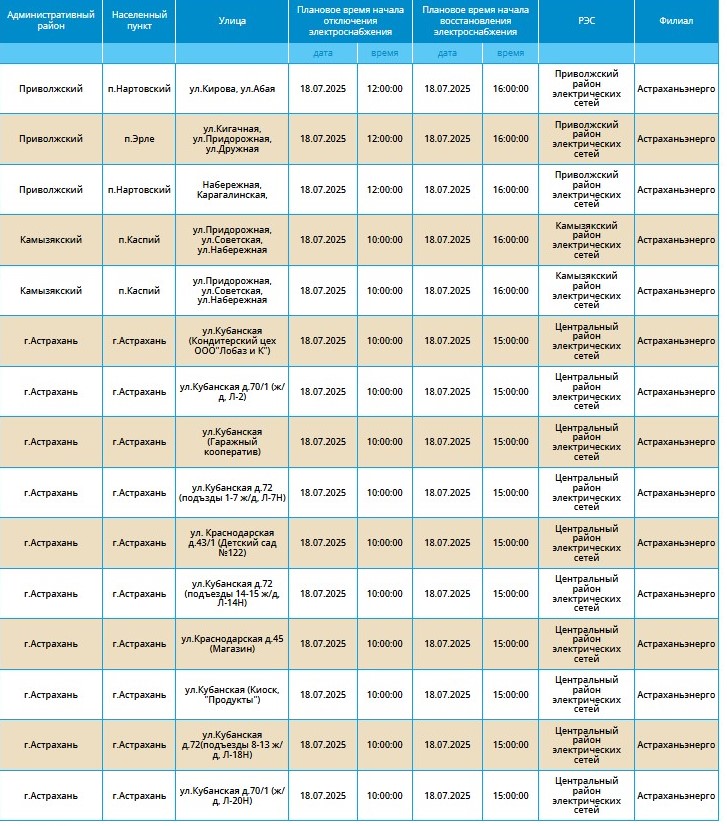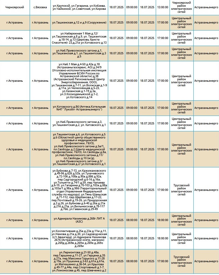 В Астрахани, к примеру, это коснется более сорока улиц. Также без электричества останутся девять сел, расположенных в Приволжском, Камызякском, Ахтубинском, Икрянинском и Черноярском районах. Список можно посмотреть в таблице ниже.