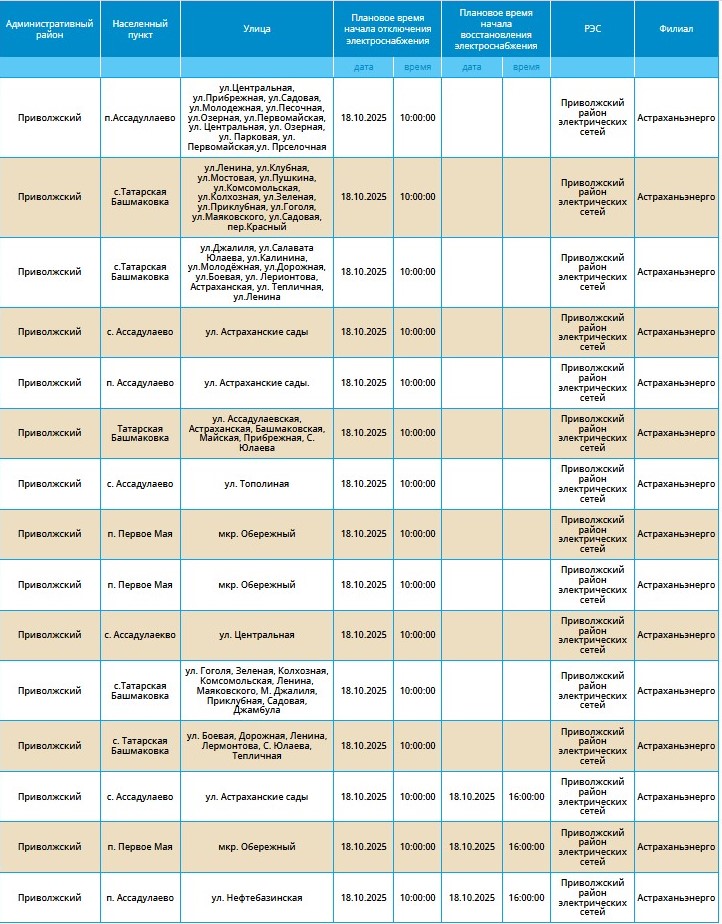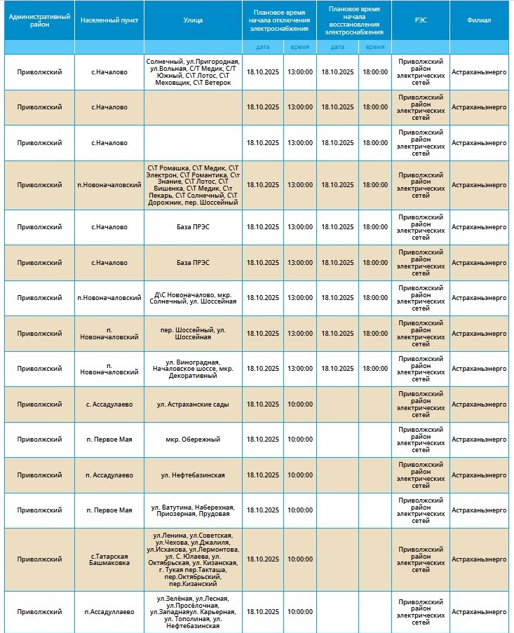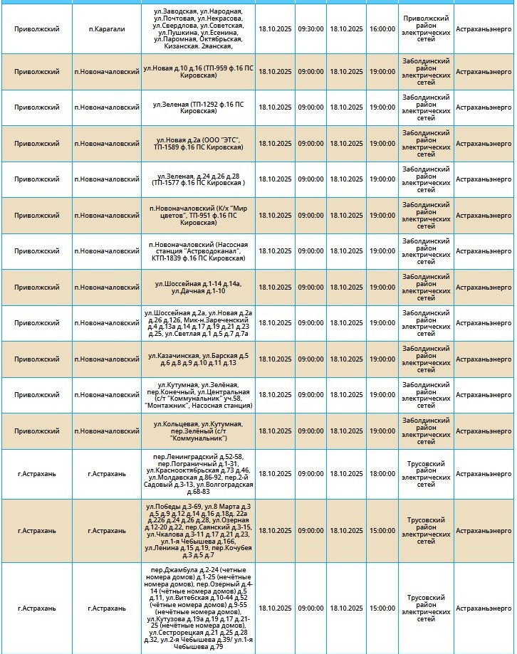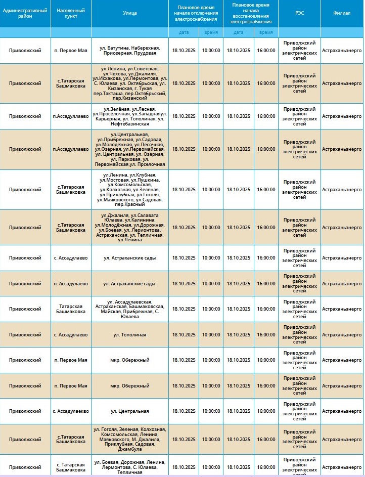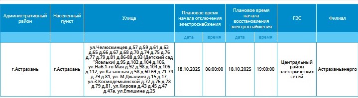 Массовые перебои в электроснабжении продолжатся и в субботу. 18 октября отключение света коснется несколько населенных пунктов Астраханской области. Astrakhanpost.ru выяснил, какие из них попали в число «счастливчиков».