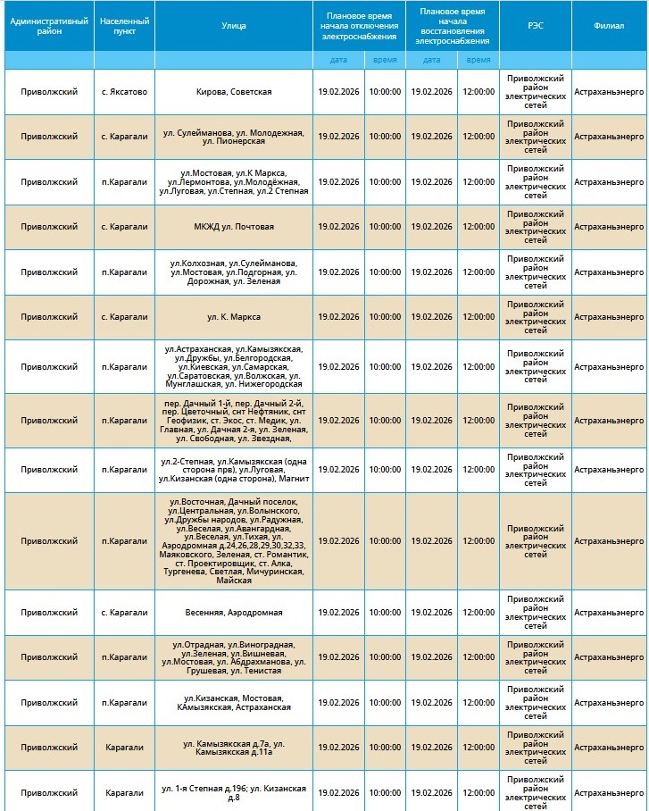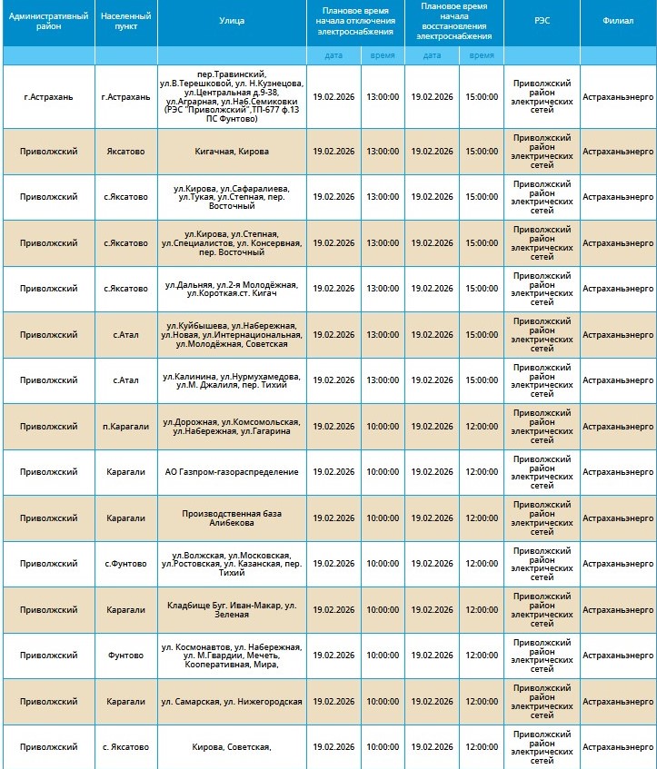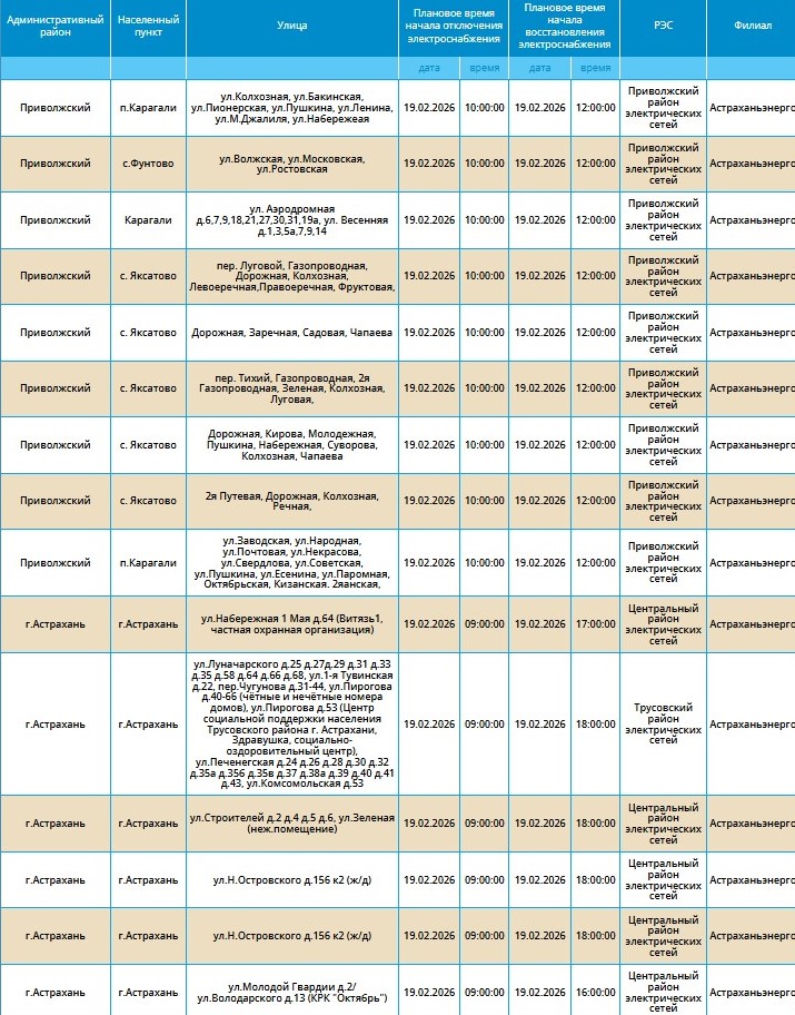Массовые перебои в электроснабжении продолжатся и в четверг. 19 февраля отключат свет в ряде населенных пунктов Астраханской области.