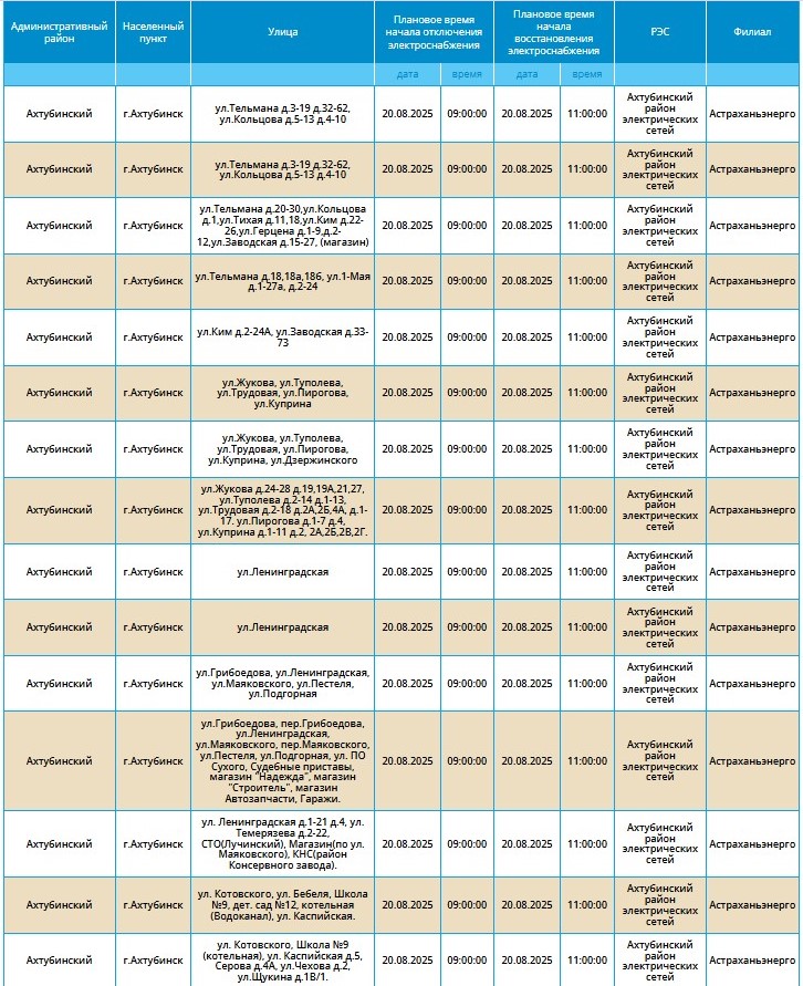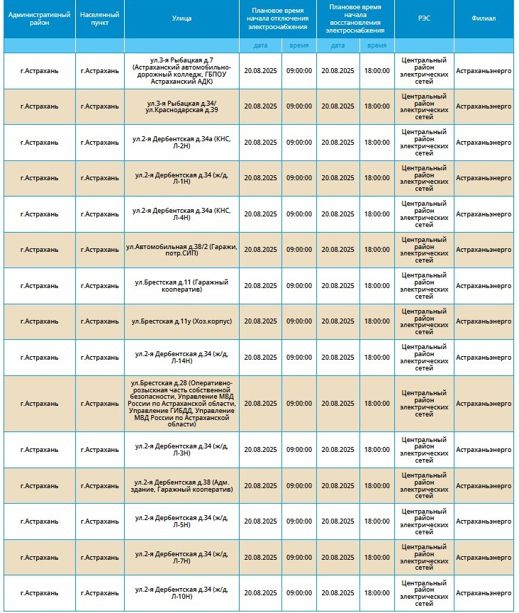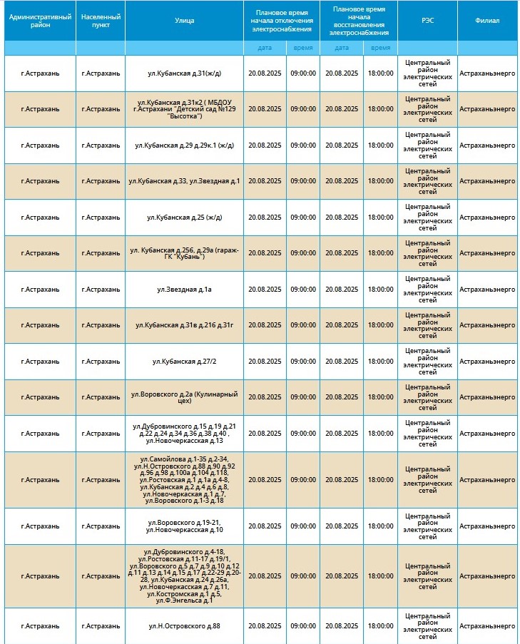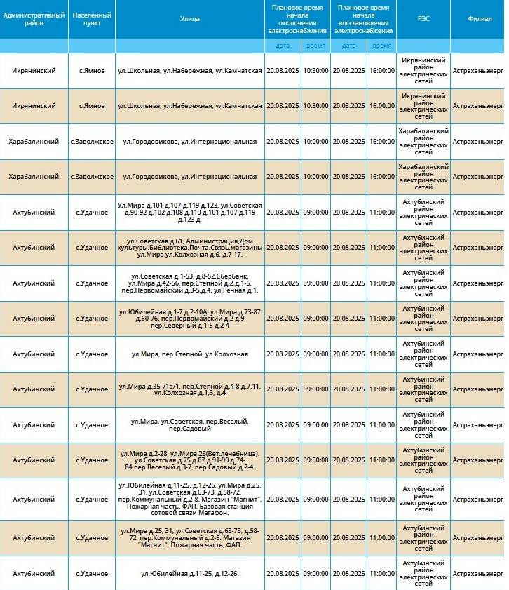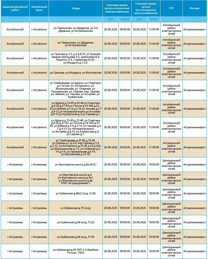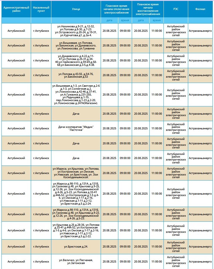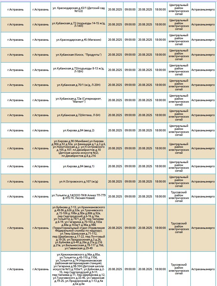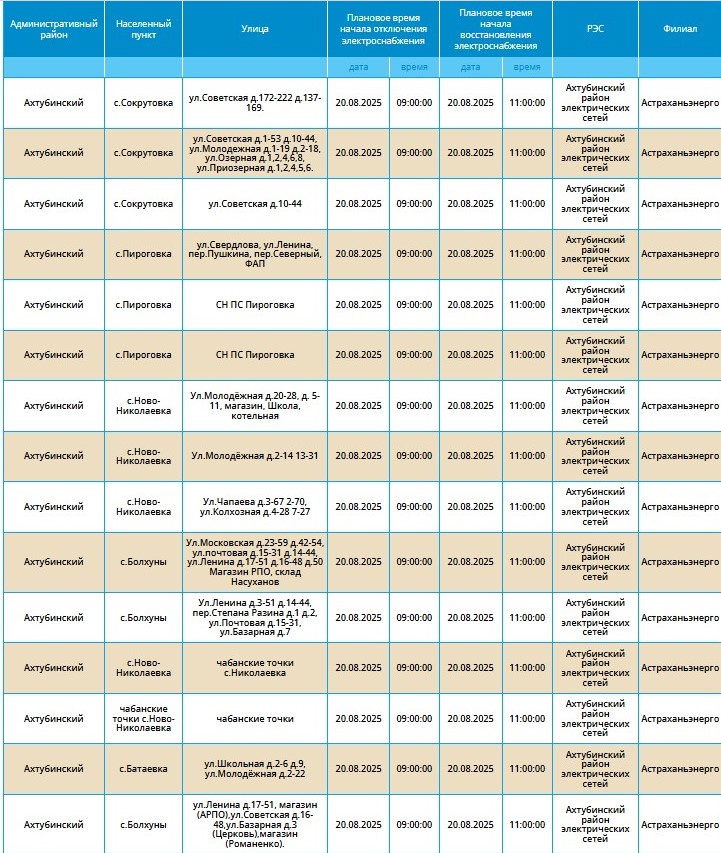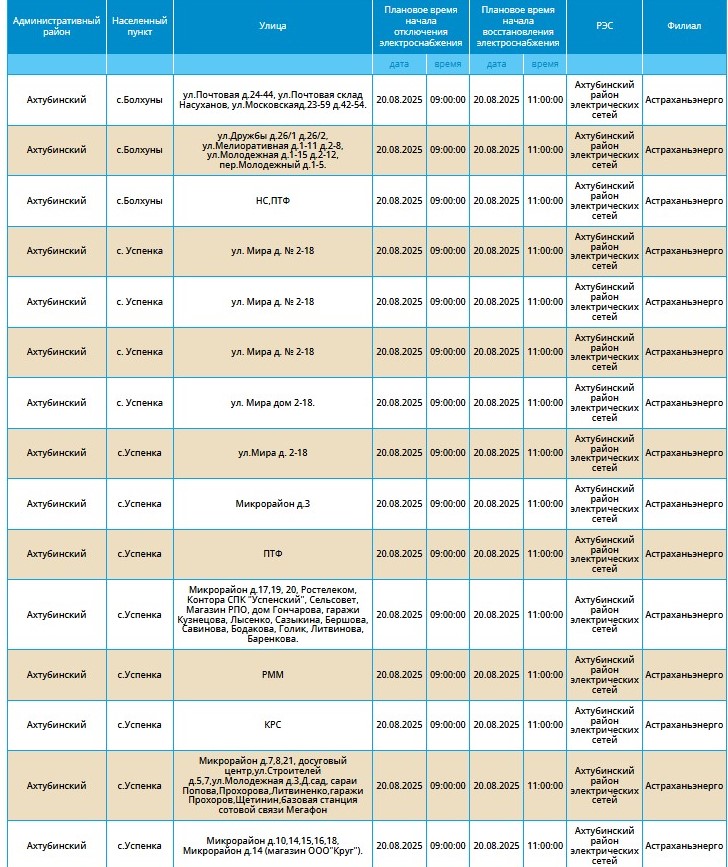 Главный «удар» примут на себя города Астрахань и Ахтубинск. В них без электричества на несколько часов останутся десятки улиц. Также под отключение попадает ряд адресов в селах и поселках Икрянинского, Ахтубинского и Харабалинского районов. Список смотрите в таблице ниже.