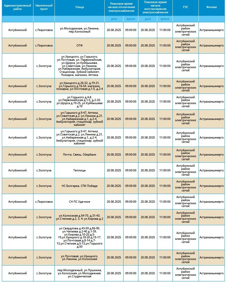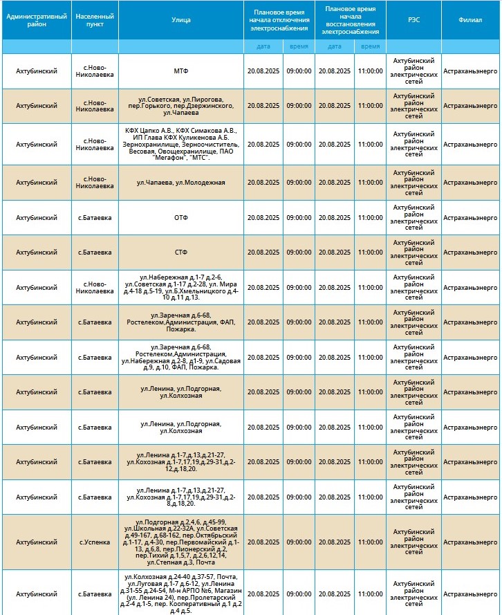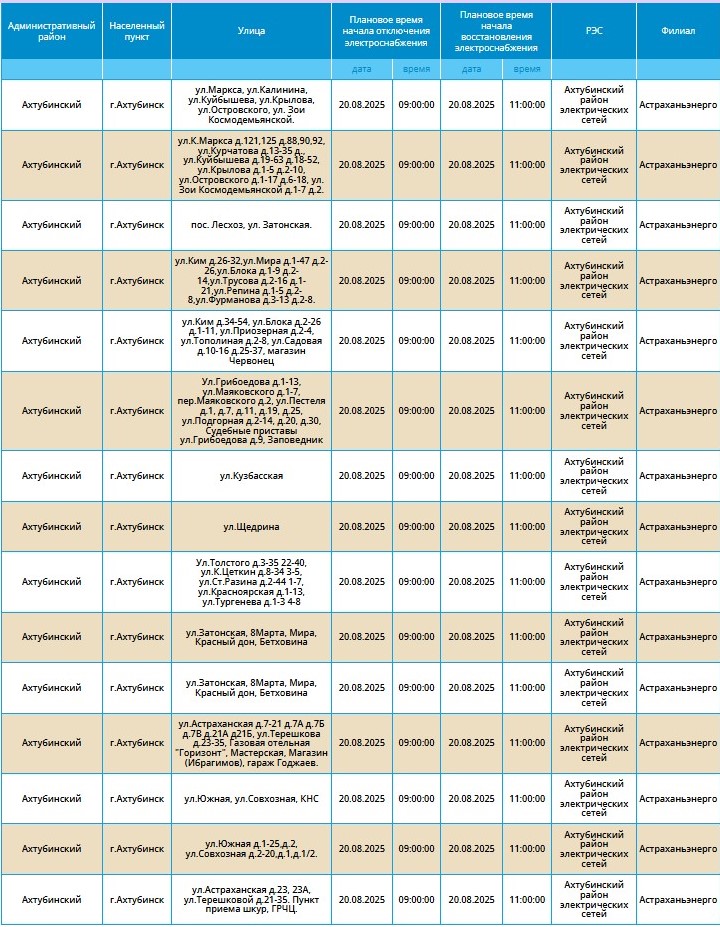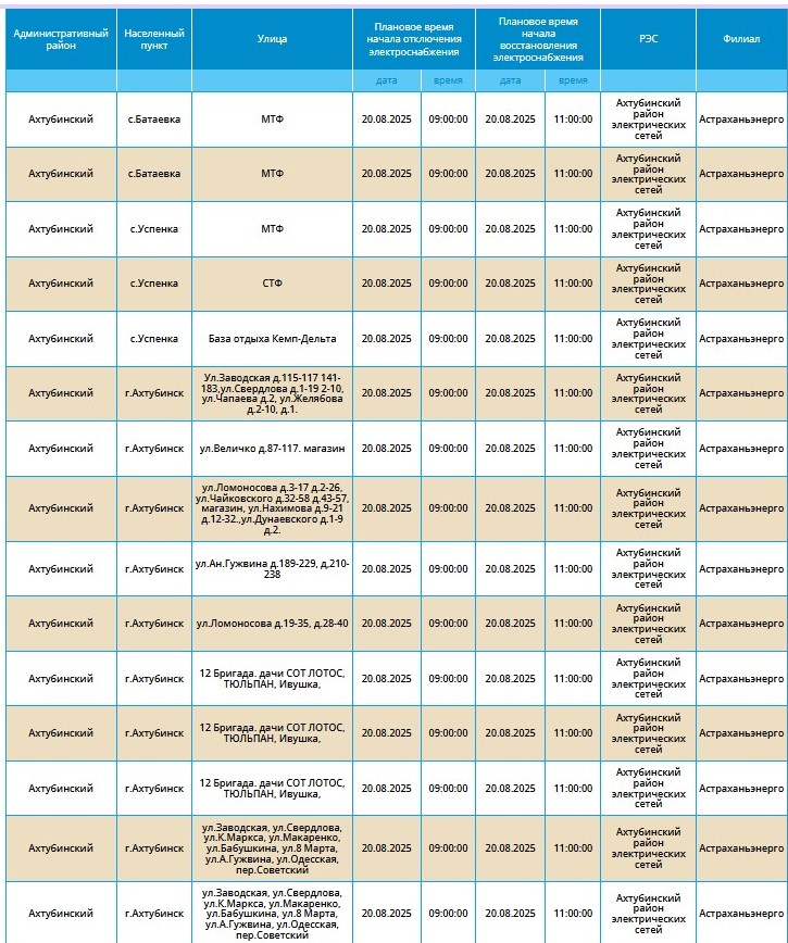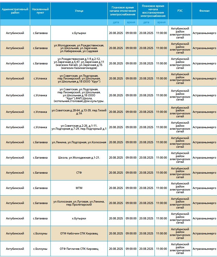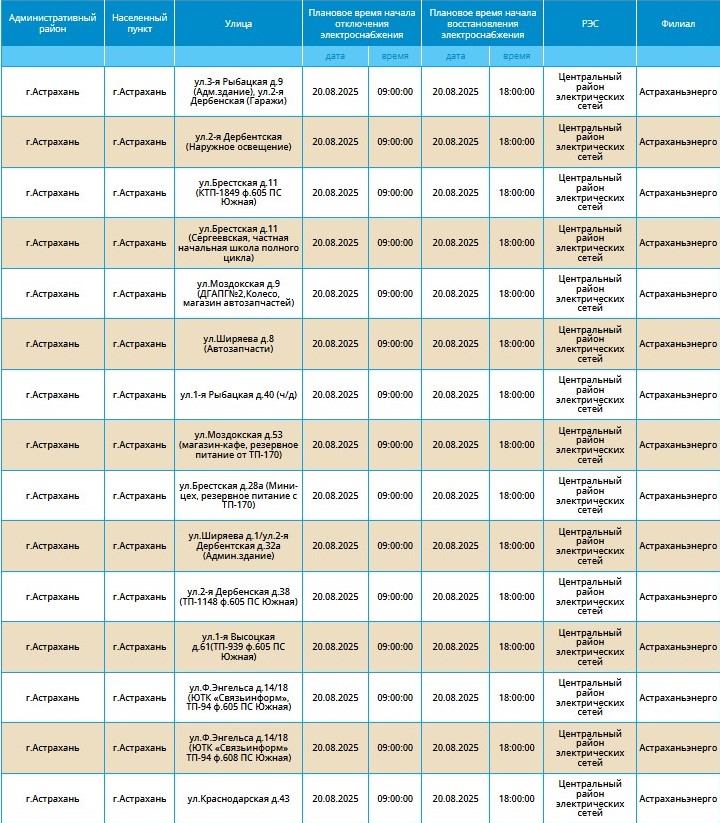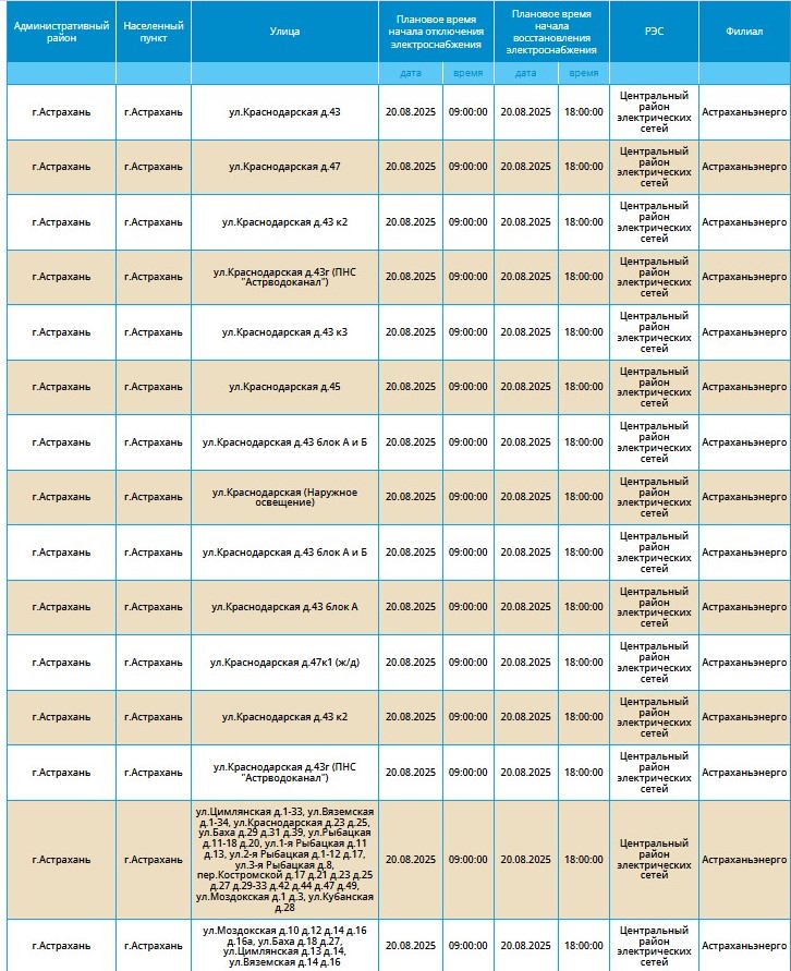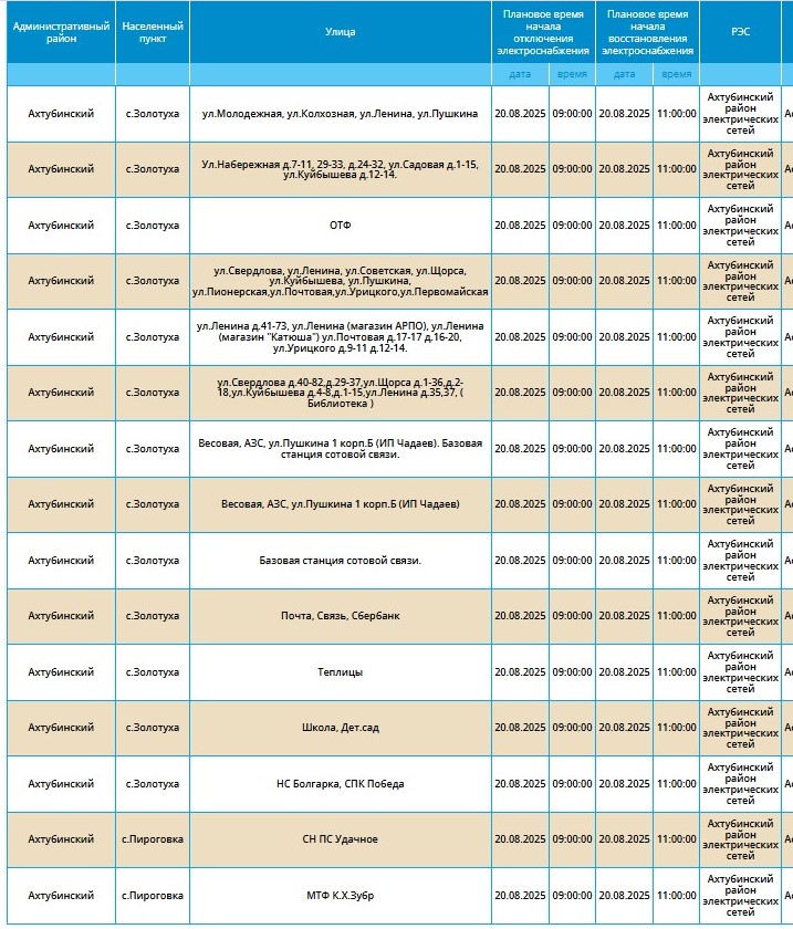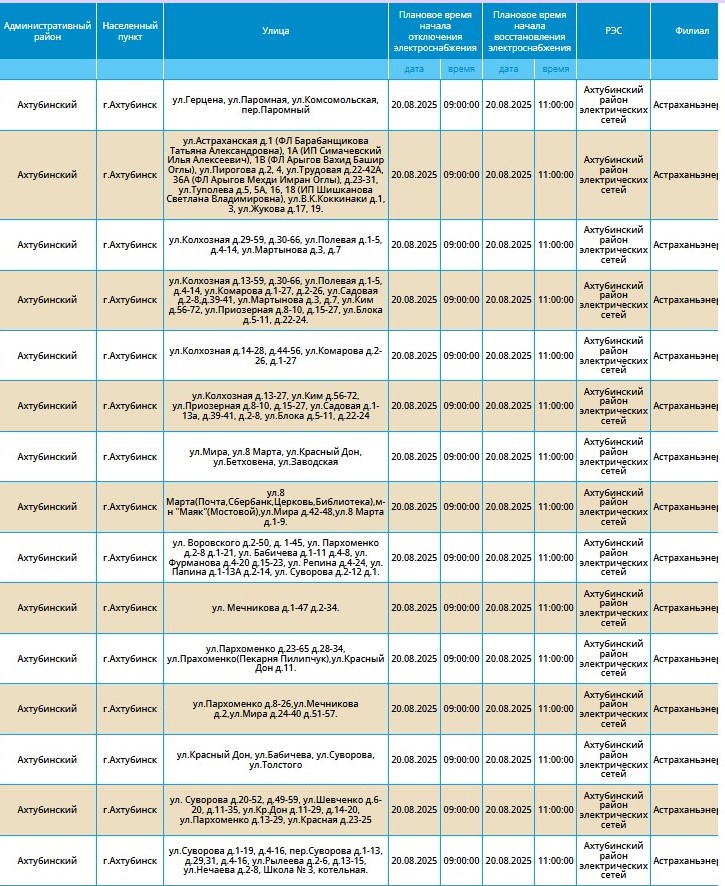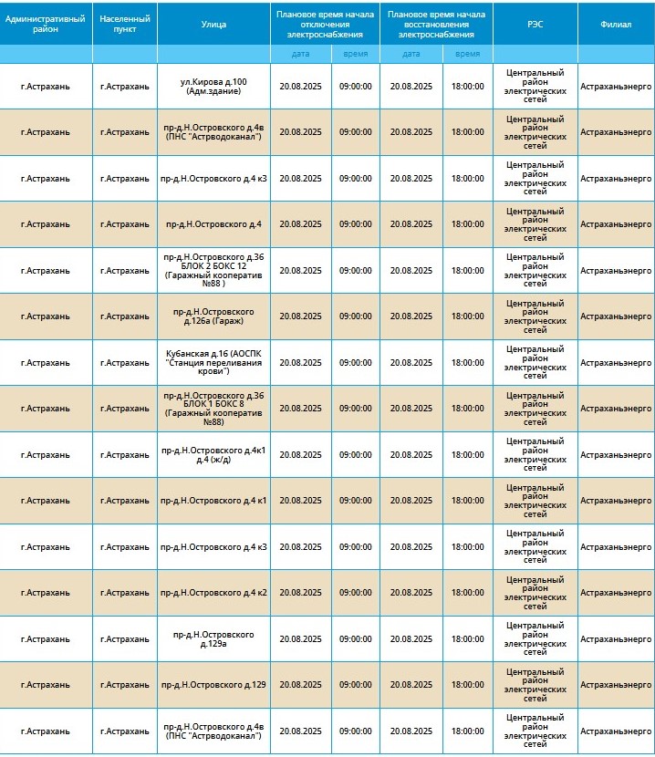Главный «удар» примут на себя города Астрахань и Ахтубинск. В них без электричества на несколько часов останутся десятки улиц. Также под отключение попадает ряд адресов в селах и поселках Икрянинского, Ахтубинского и Харабалинского районов. Список смотрите в таблице ниже.
