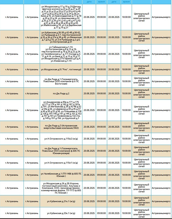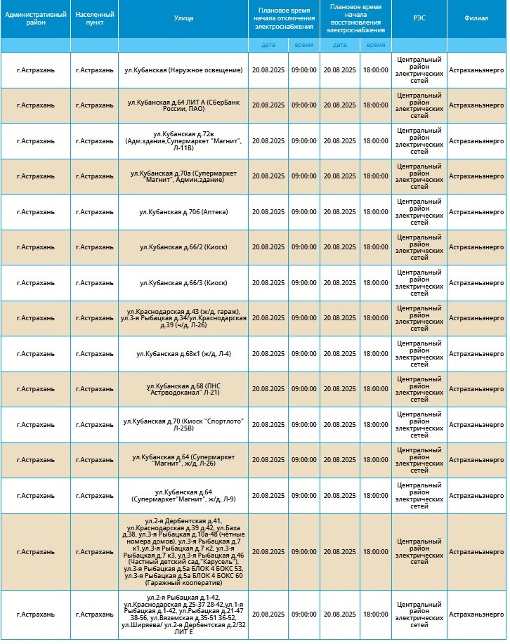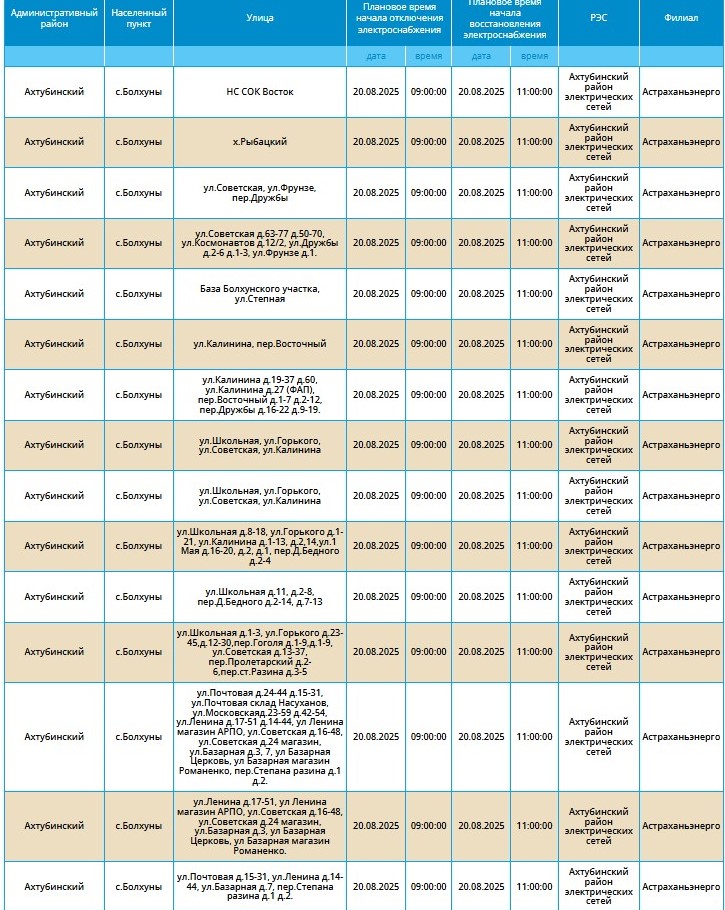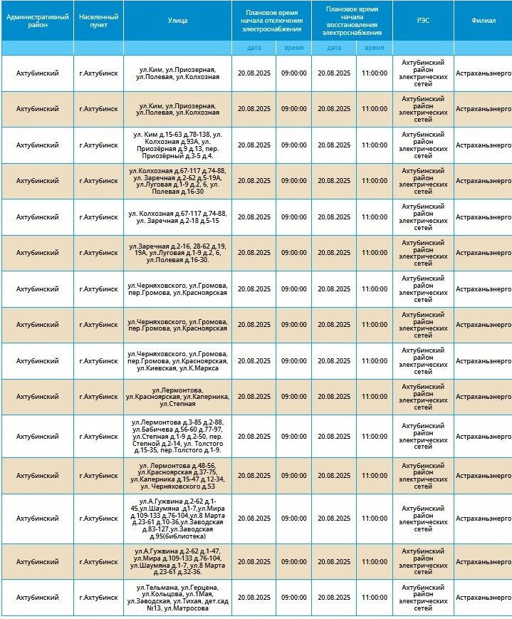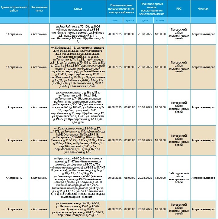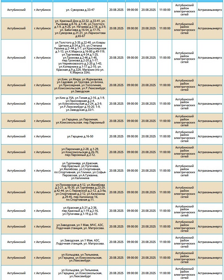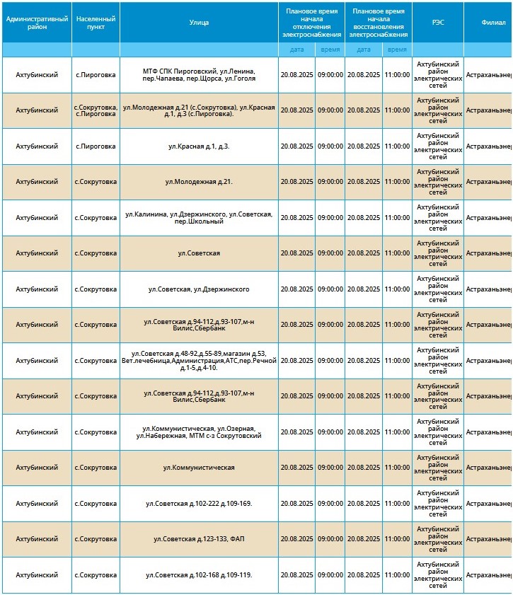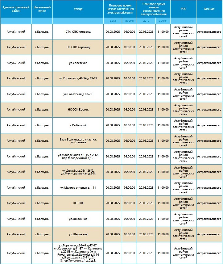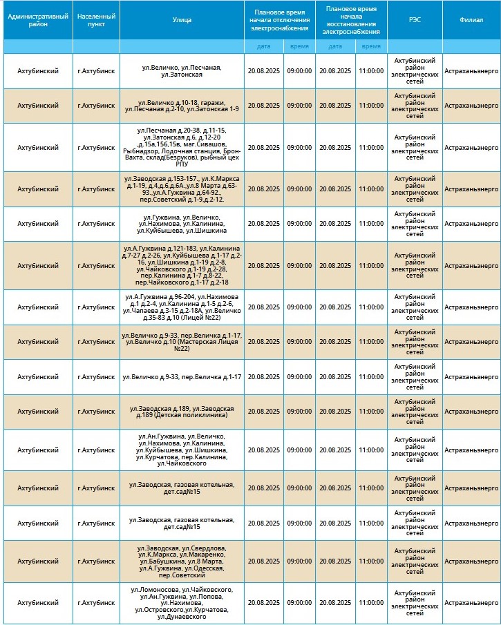 Главный «удар» примут на себя города Астрахань и Ахтубинск. В них без электричества на несколько часов останутся десятки улиц. Также под отключение попадает ряд адресов в селах и поселках Икрянинского, Ахтубинского и Харабалинского районов. Список смотрите в таблице ниже.