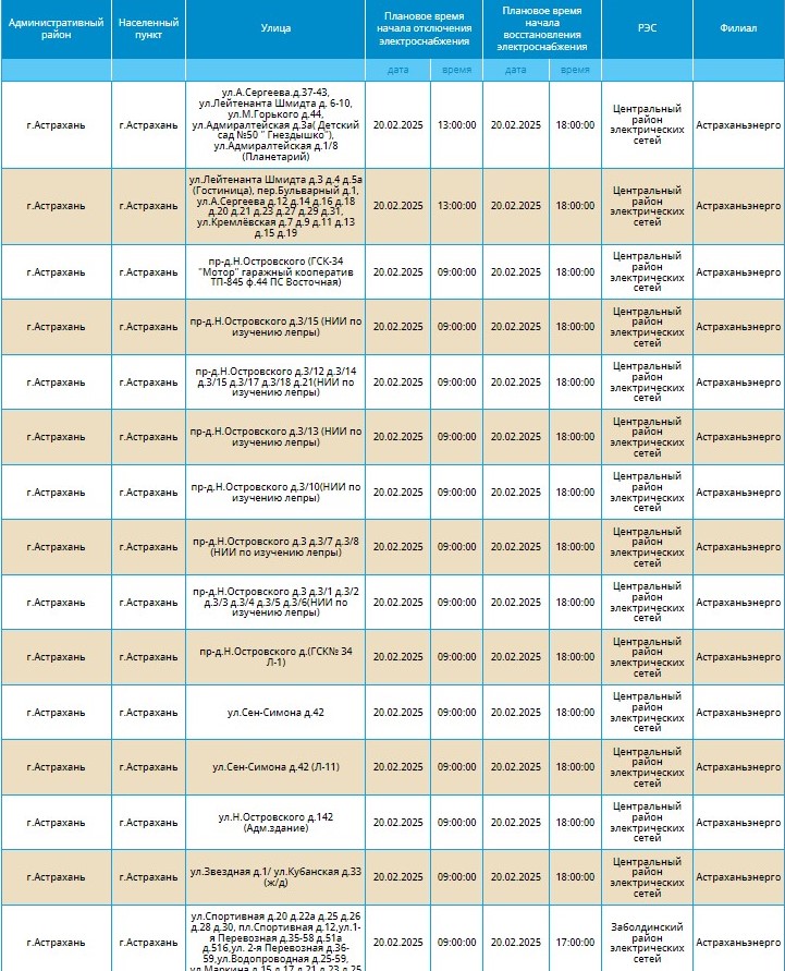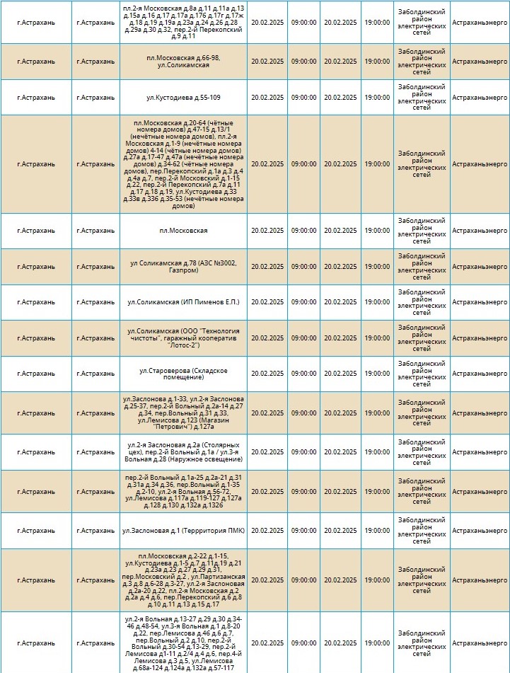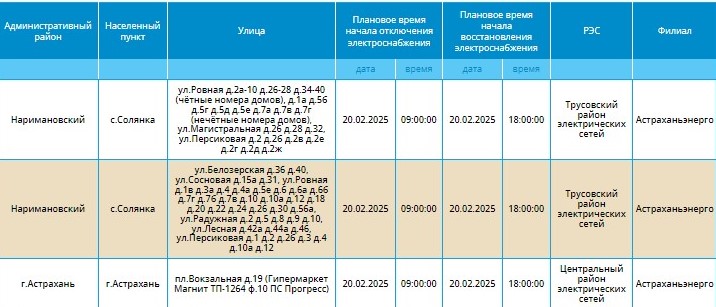 Как пояснили в ресурсоснабжающей организации, завтрашние отключения будут плановыми. И связаны они с проведением технических работ. В этот раз энергетики сосредоточат свое внимание на города Астрахани и селе Солянка Наримановского района. Точнее, на некоторых городских и сельских улицах, список которых указан в таблице ниже.