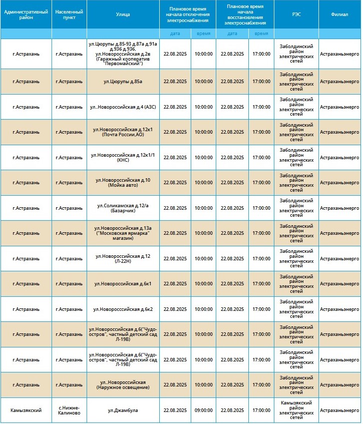 Без электричества останутся шестнадцать улиц Астрахани. Также под отключение попадает ряд адресов в пяти селах и поселках Камызякского и Харабалинского районов. Список смотрите в таблице ниже.