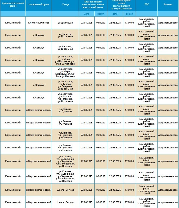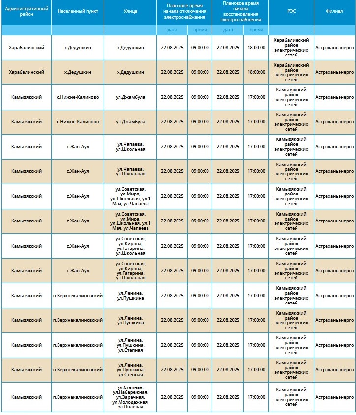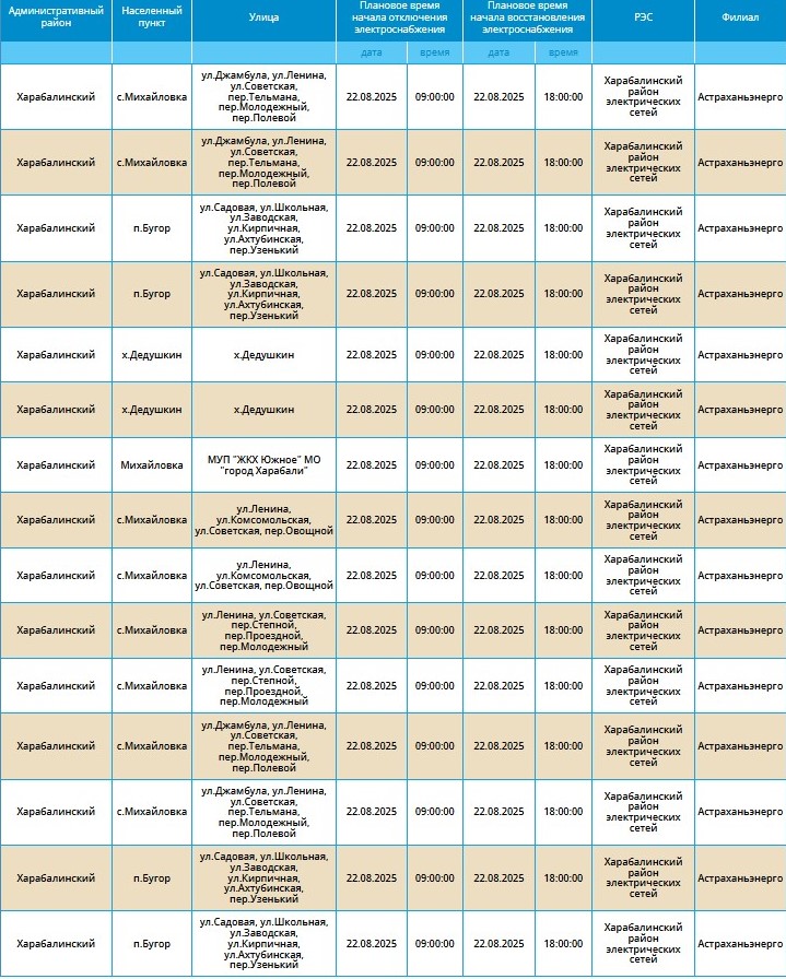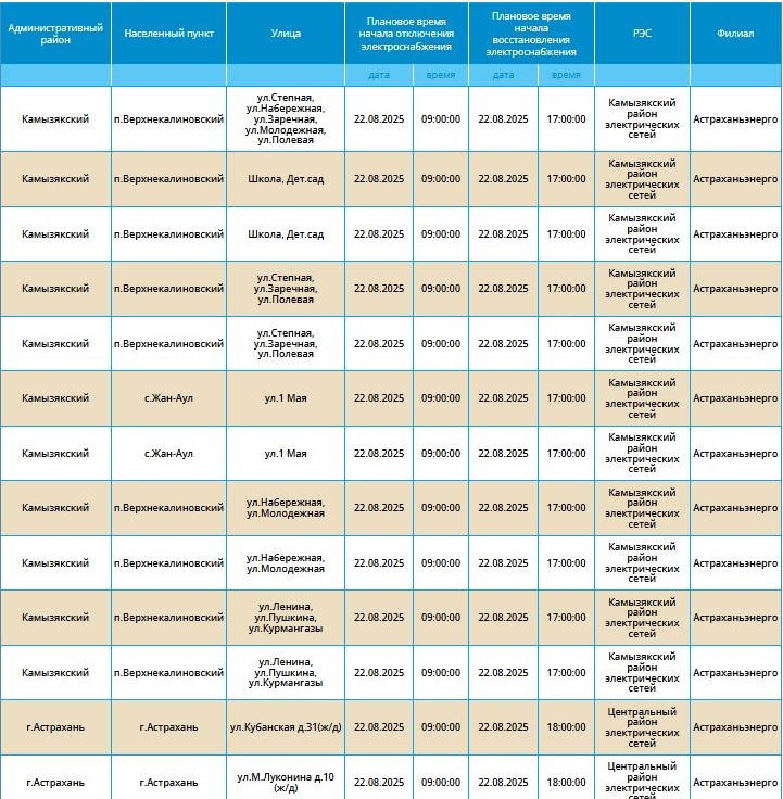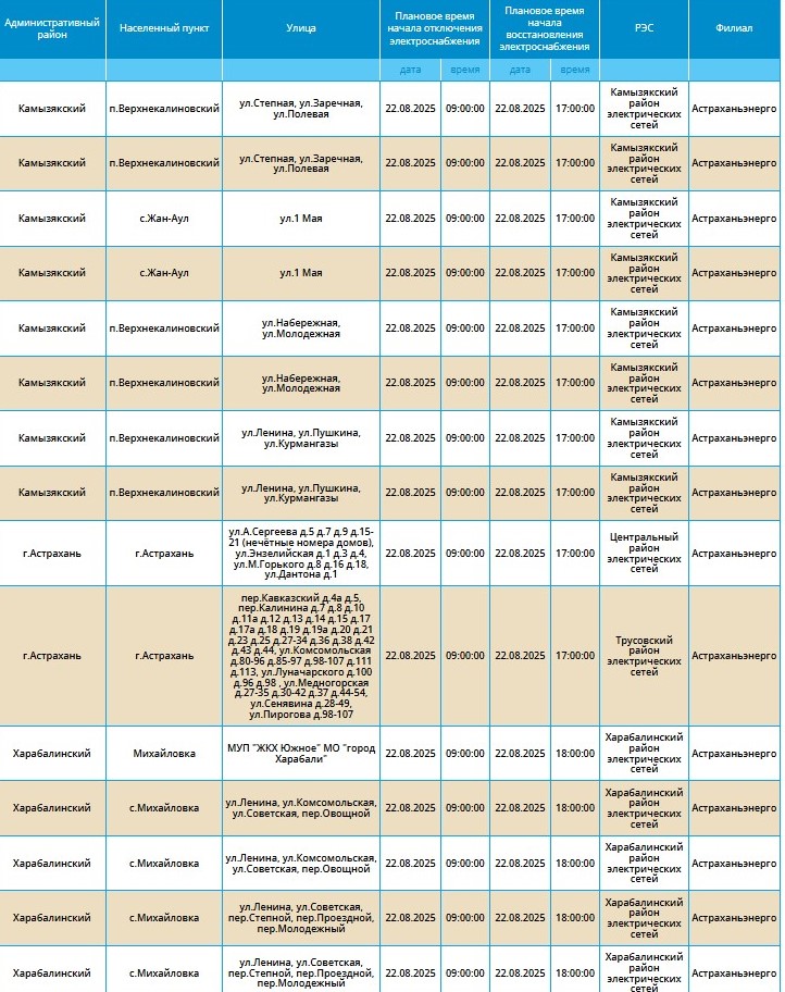 Массовые перебои в электроснабжении продолжатся и в пятницу. 22 августа отключат свет в ряде населенных пунктов Астраханской области. Расскажем, кто же попал в число «счастливчиков».