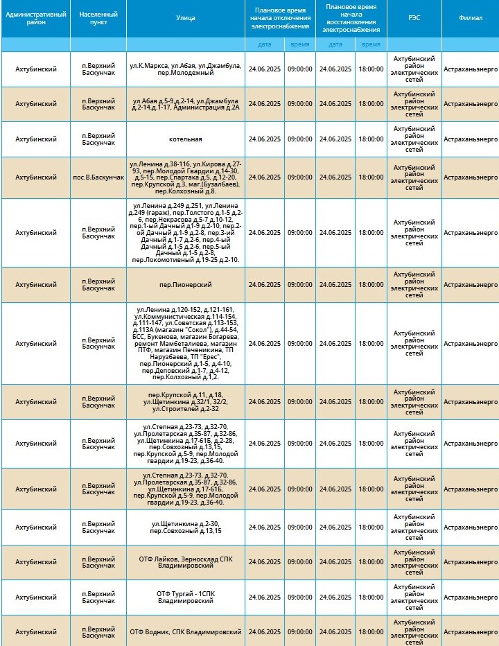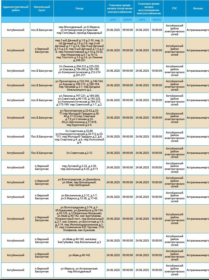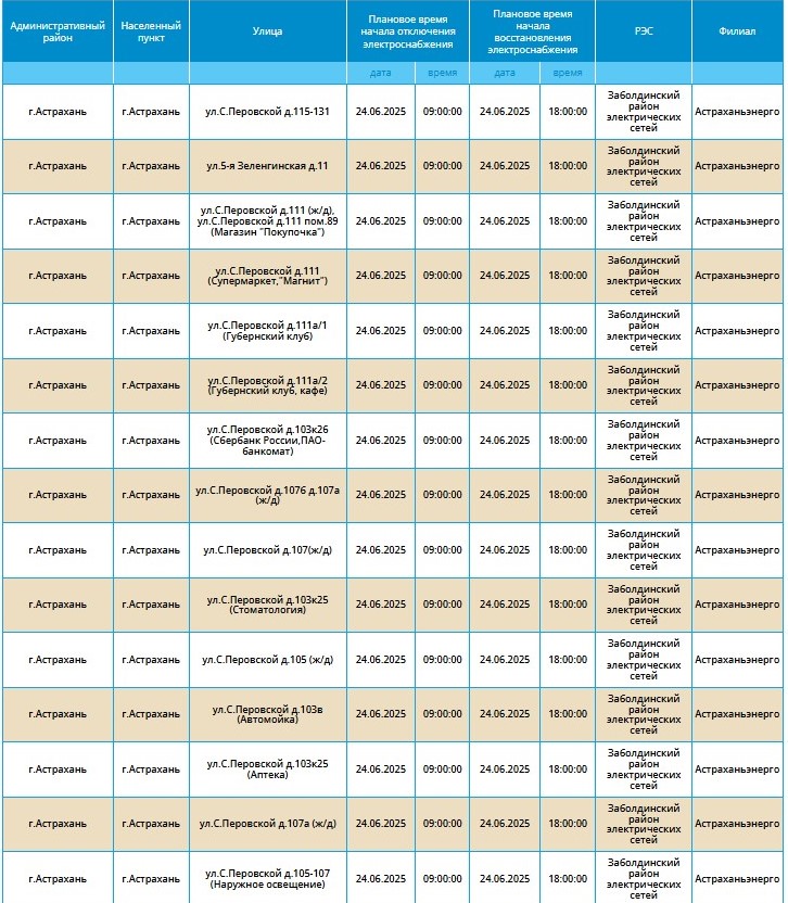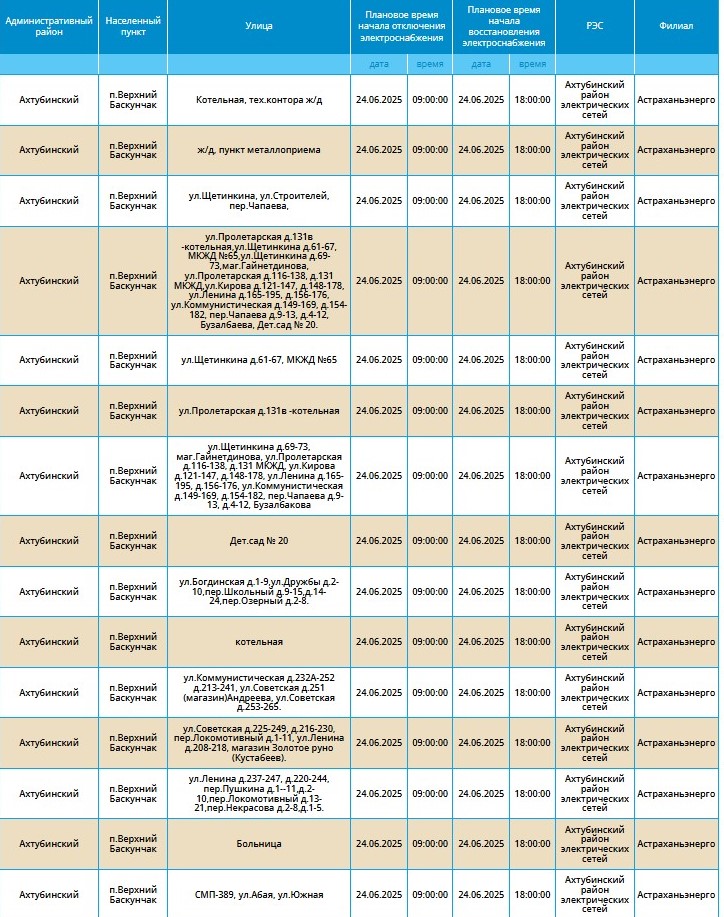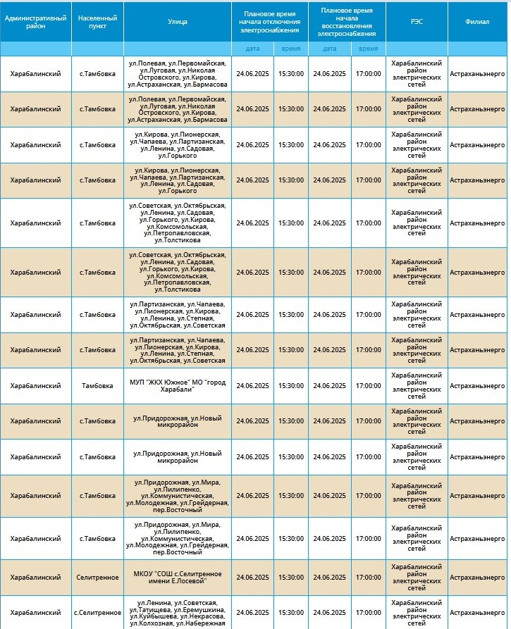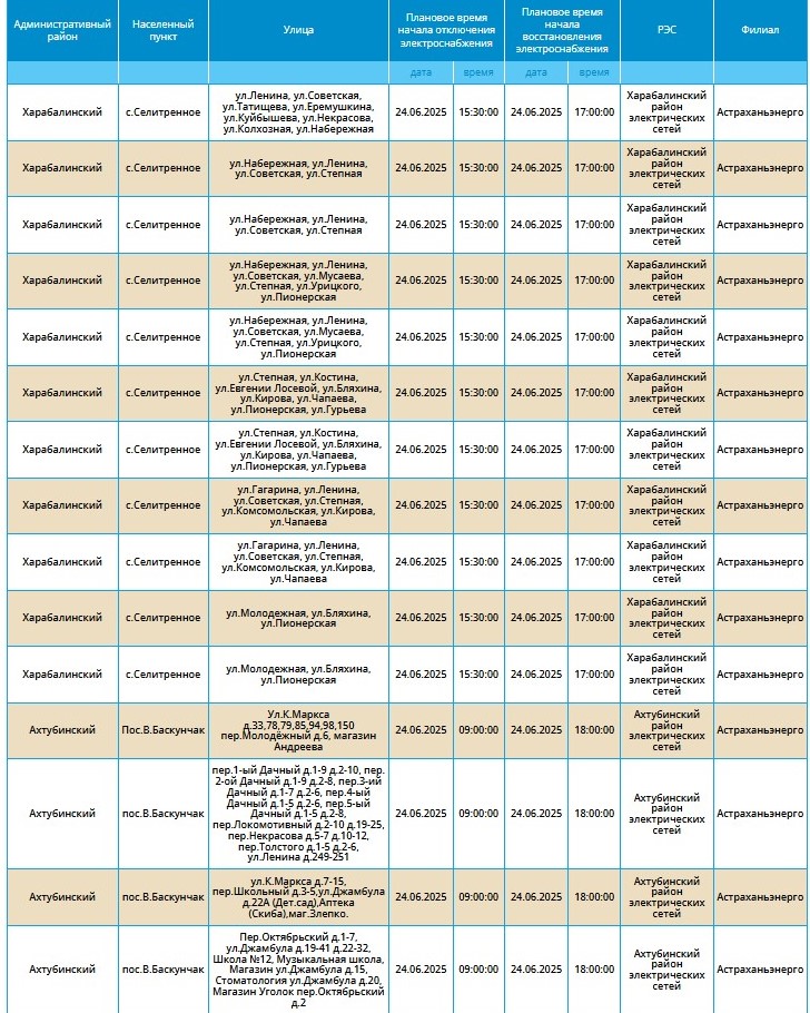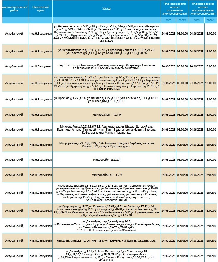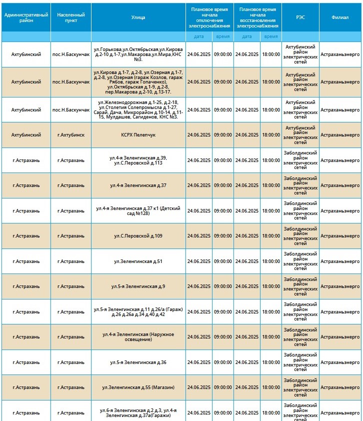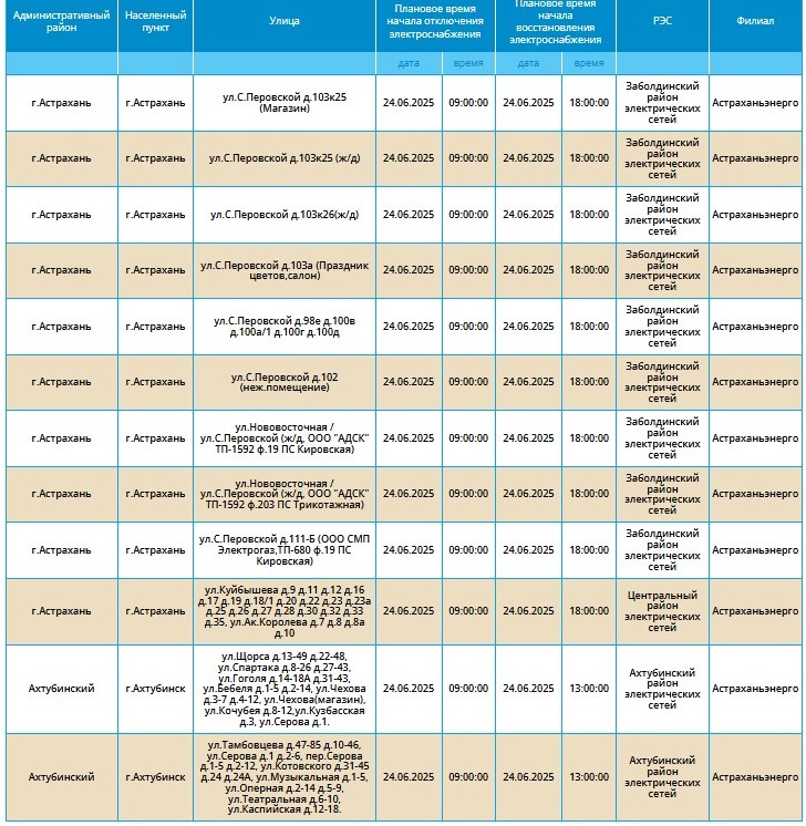 Как пояснили в ресурсоснабжающей организации, завтрашняя приостановка подачи ресурса связана с проведением плановых технических работ. Энергетики сосредоточат свои усилия на ряде адресов в городах Астрахань и Ахтубинск. А также четырех селах и поселках Ахтубинского и Харабалинского районов. Список улиц, которые на несколько часов останутся без электричества, смотрите в таблице ниже.