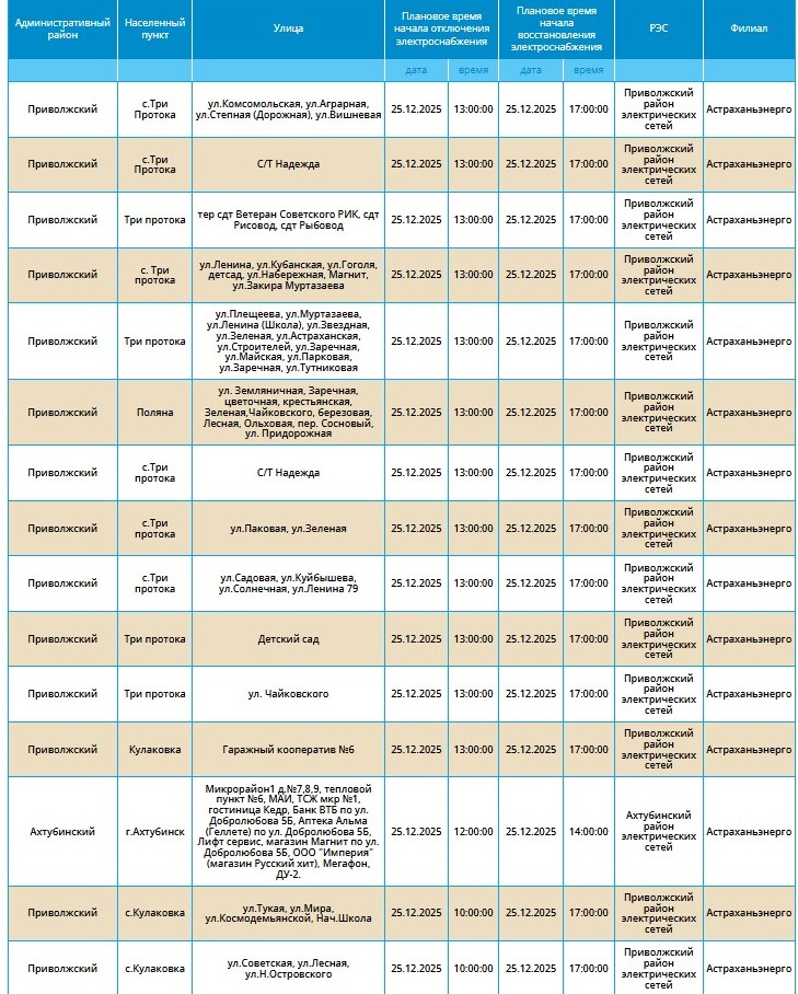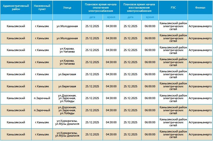 Массовые перебои в электроснабжении продолжатся и в четверг. 25 декабря отключат свет в ряде населенных пунктов Астраханской области. Расскажем, какие из них попали в число «счастливчиков».