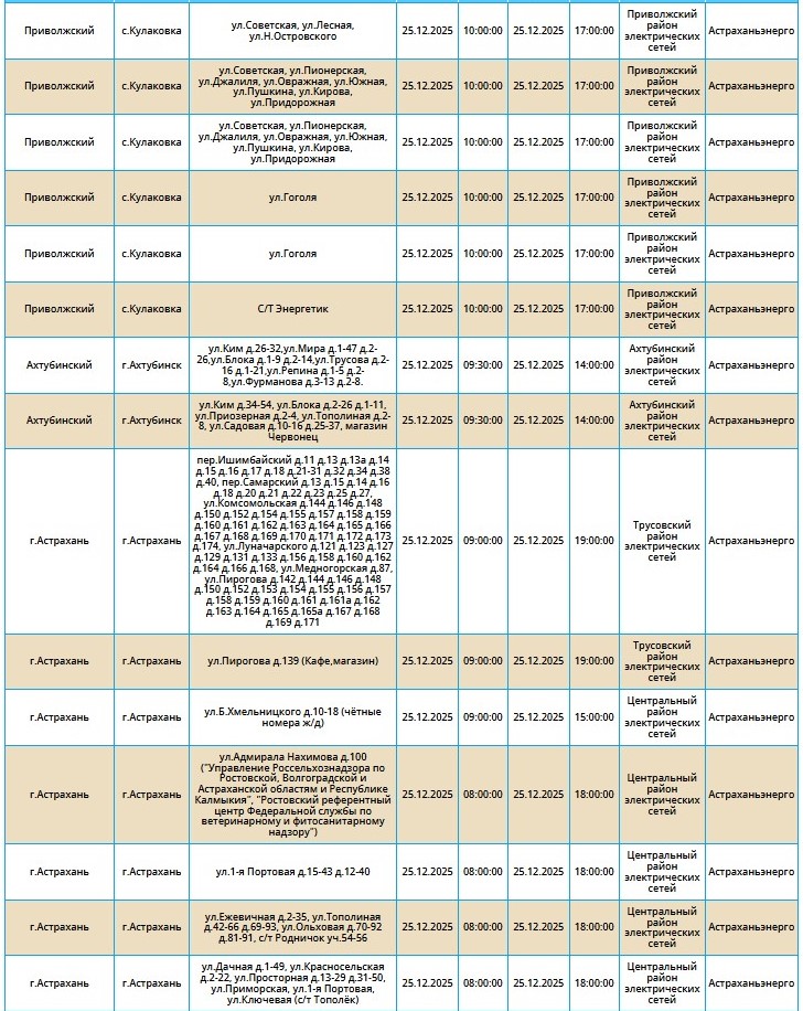 25 декабря отключение света коснется Астрахани и двух райцентров