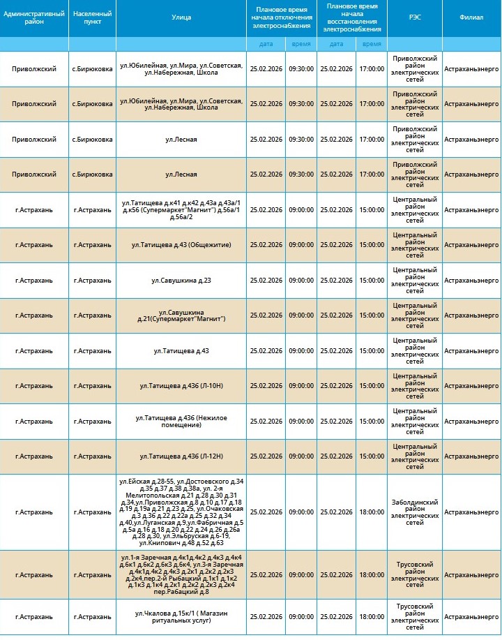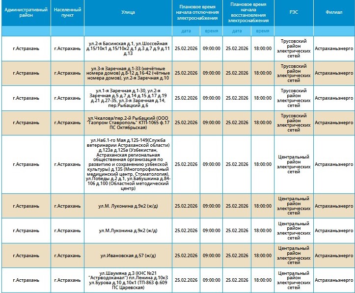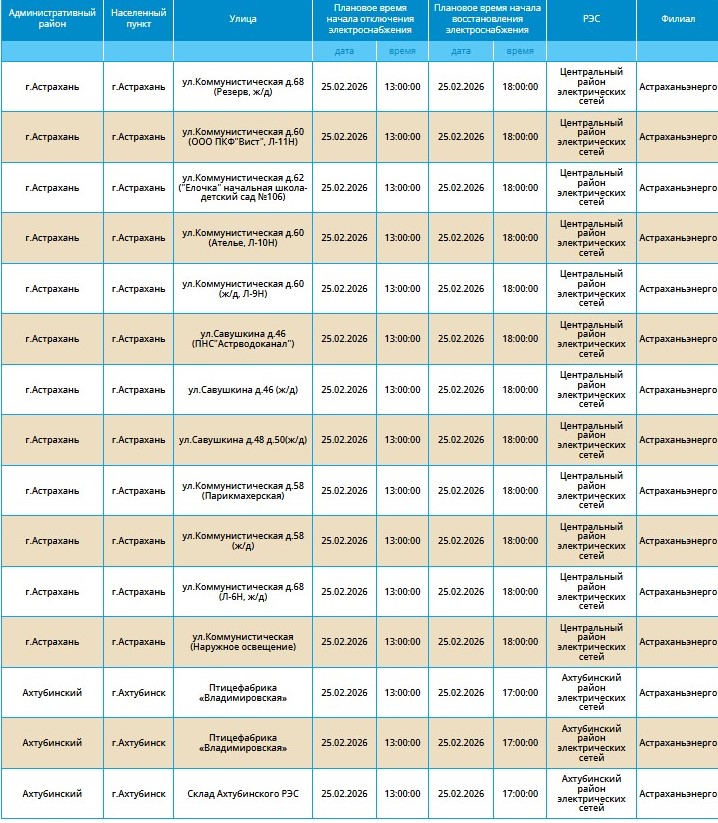 Причиной приостановки подачи ресурса в ресурсоснабжающей организации назвали проведение плановых технических работ. Чтобы ничего не мешало энергетикам выполнять свой график, по некоторым адресам не будет электричества. Под отключение попадают жители нескольких улиц городов Астрахань и Ахтубинск. А также нескольких сел Приволжского и Камызякского районов.