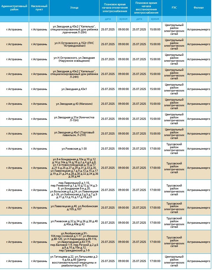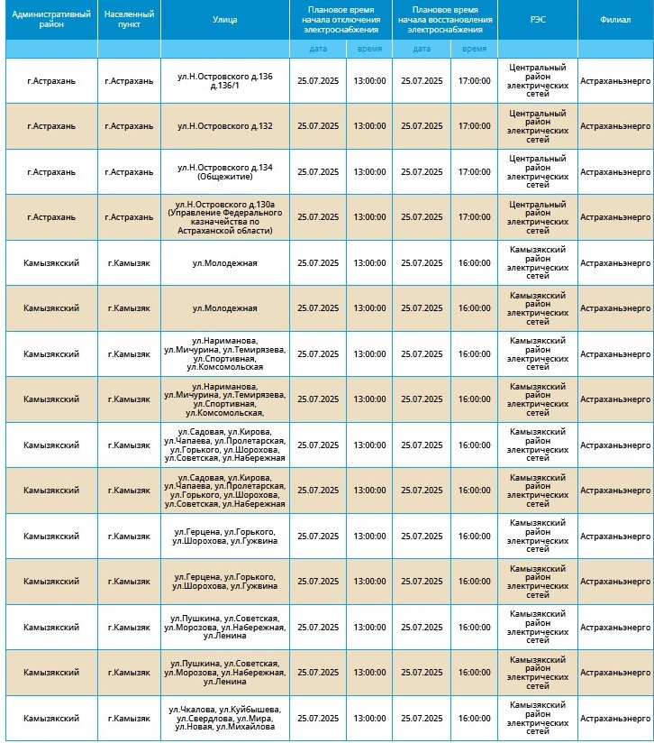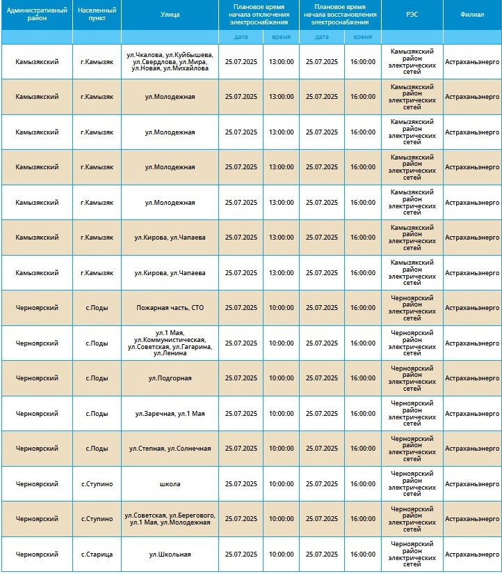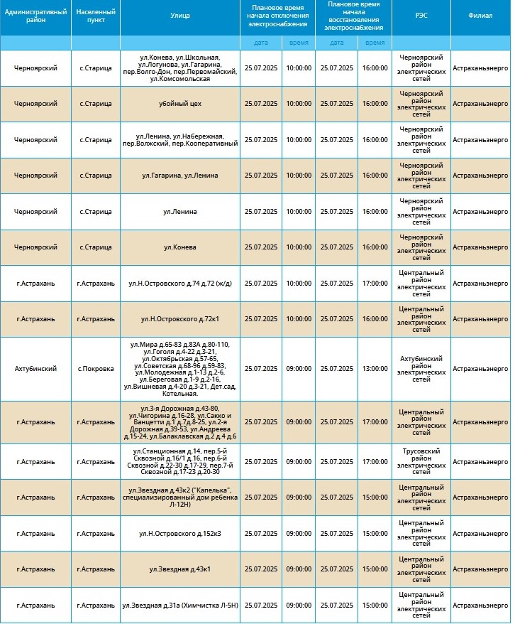 Массовые перебои в электроснабжении продолжатся и в пятницу. 25 июля отключат свет в ряде населенных пунктов Астраханской области. Расскажем, кто же вошел в список «счастливчиков».