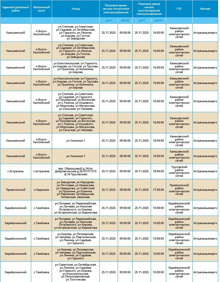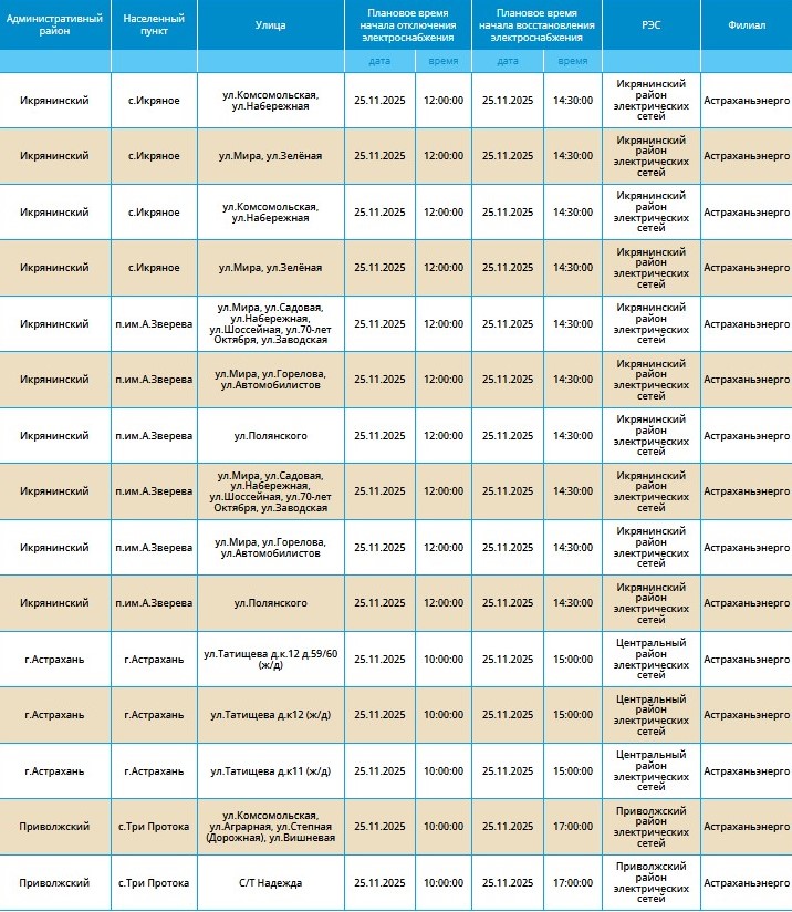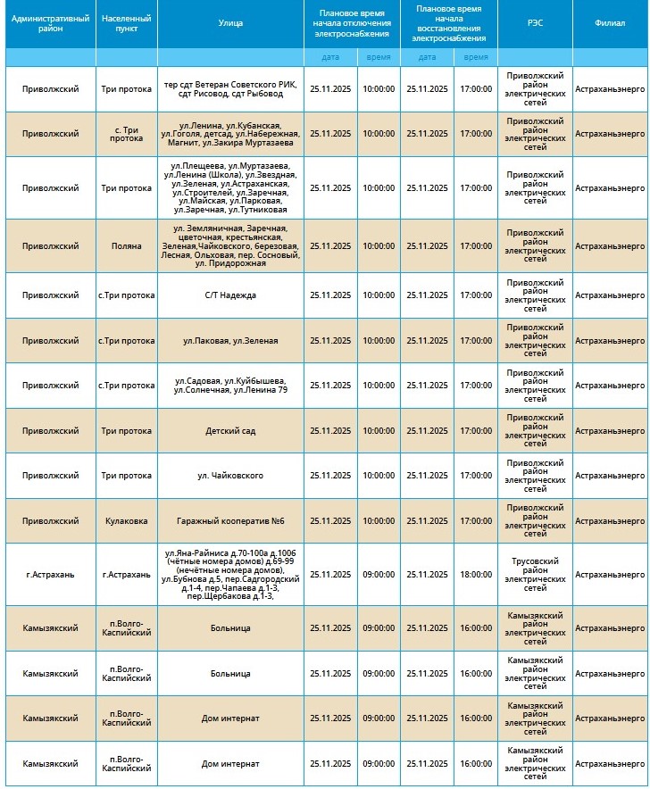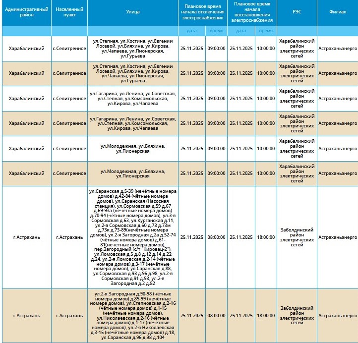 Как сообщают в ресурсоснабжающей организации, приостановка подачи ресурса связана с проведением плановых технических работ. Без электричества на несколько часов останутся десятки улиц в Астрахани, а также в некоторых селах четырех областных районов: Приволжского, Камызякского, Икрянинского и Харабалинского.
