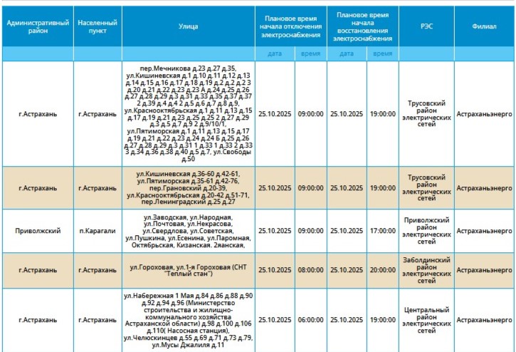 Массовые перебои в электроснабжении продолжатся и в субботу. В двух населенных пунктах Астраханской области будет отключение света.