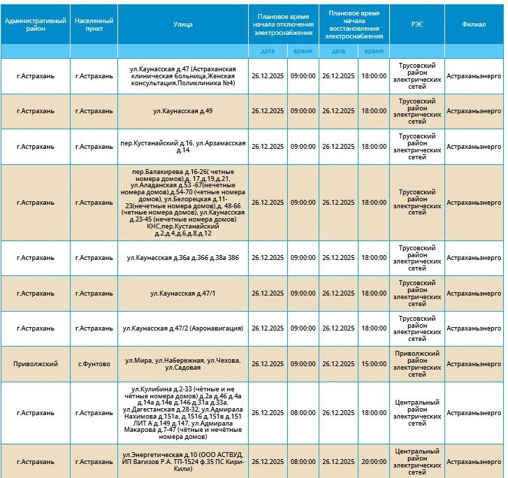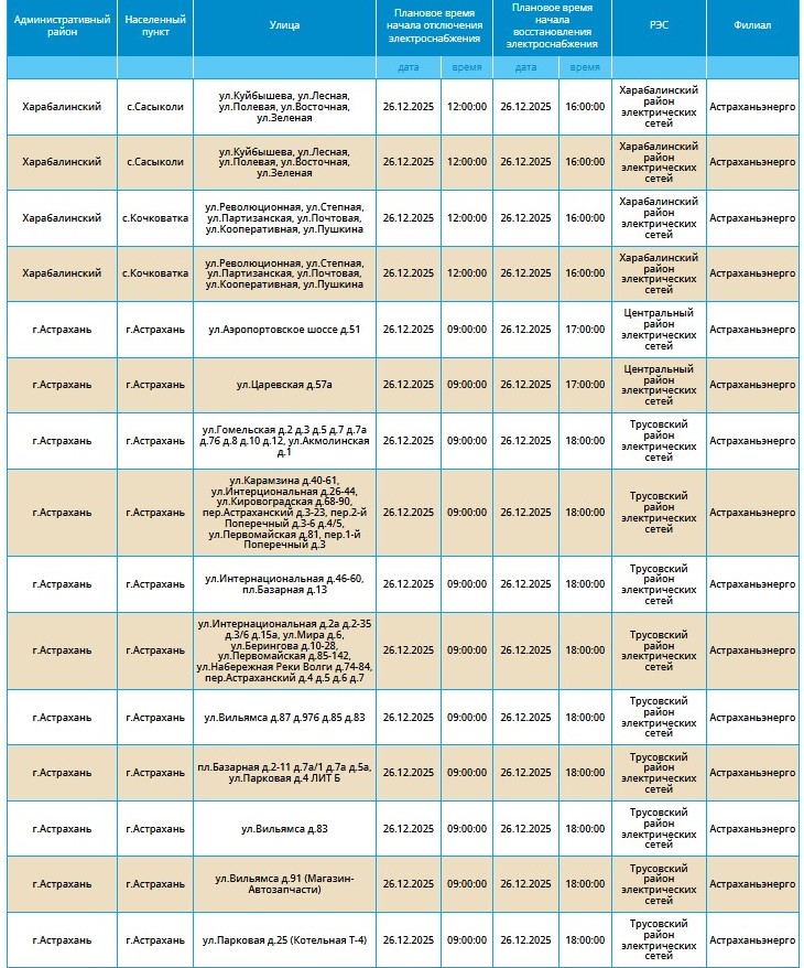Без электричества на несколько часов останутся десятки улиц в Астрахани, а также ряда сел, расположенных в Харабалинском и Приволжском районах. Список адресов «счастливчиков» смотрите в таблице ниже.