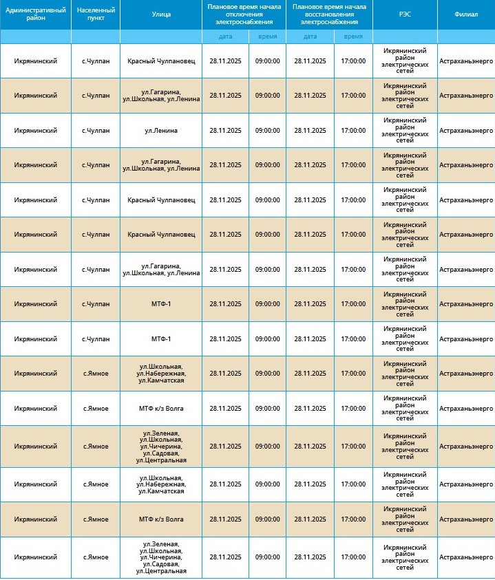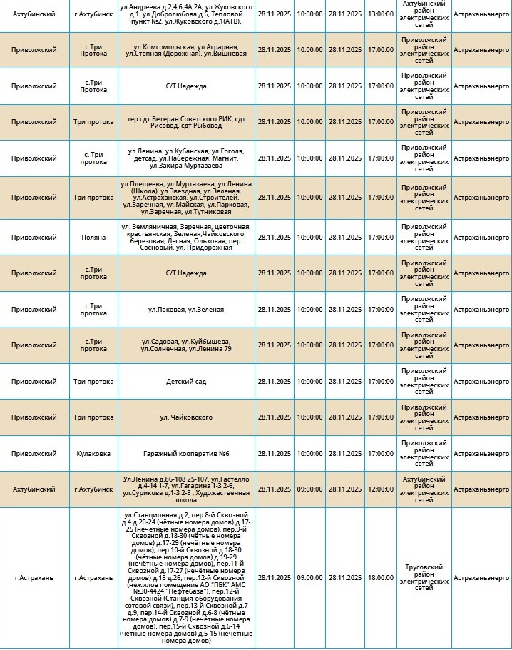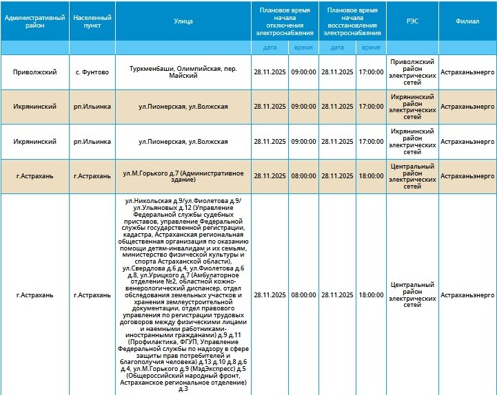 Без электричества на несколько часов останутся десятки улиц в городах Астрахань и Ахтубинск. А также в семи селах и поселках, расположенных в Икрянинском и Приволжском районах.
