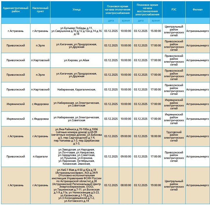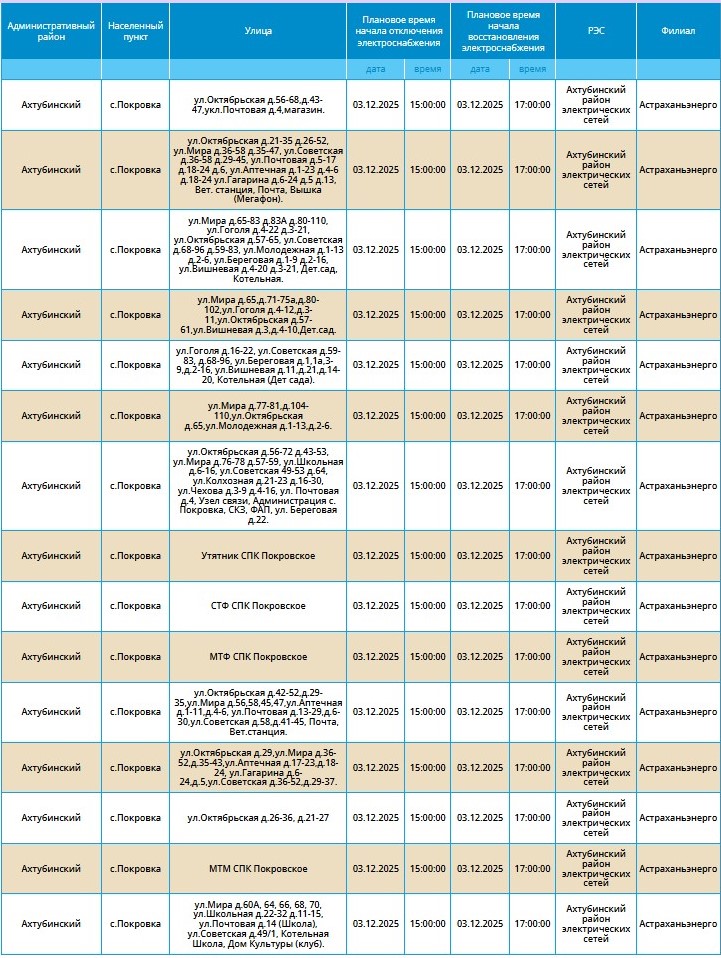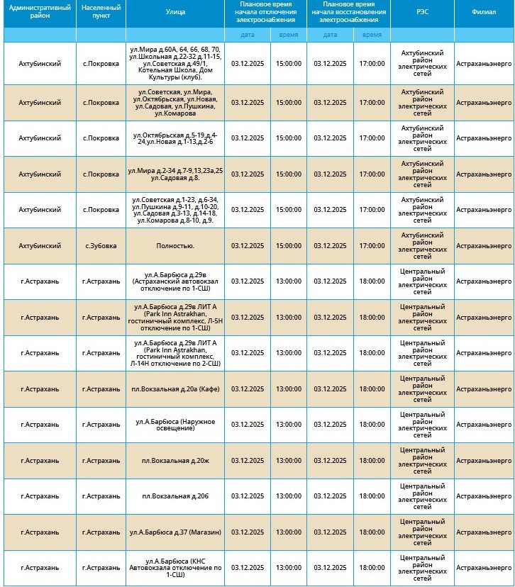 Массовые перебои в электроснабжении продолжатся и в среду. 3 декабря отключат свет в ряде населенных пунктов Астраханской области. Расскажем, какие из них попали в число «счастливчиков».