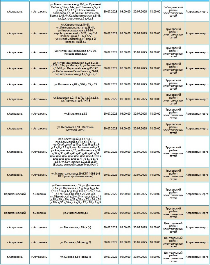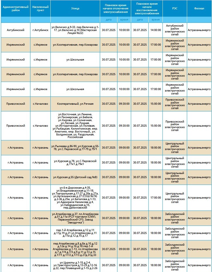 В Астрахани без электричества останутся 50 улиц. Также подача ресурса на несколько часов приостановится по нескольким адресам в Ахтубинске и трех селах. Список смотрите в таблице ниже.