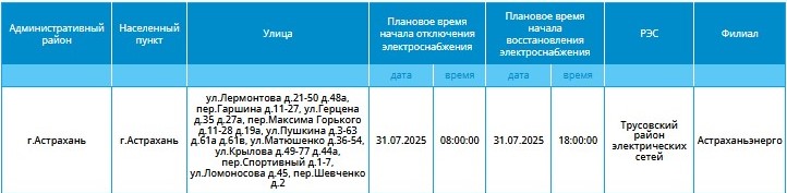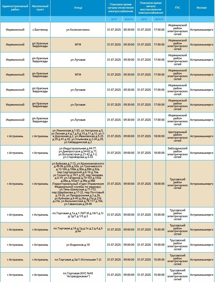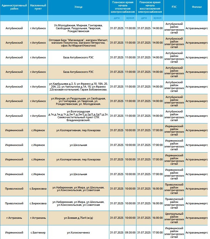 Массовые перебои в электроснабжении продолжатся и в четверг. 31 июля отключат свет в ряде населенных пунктов Астраханской области. Astrakhanpost.ru выяснил, кто же попал в число «счастливчиков».