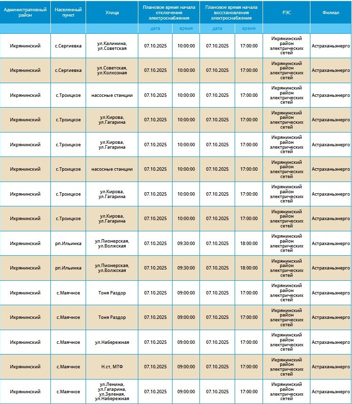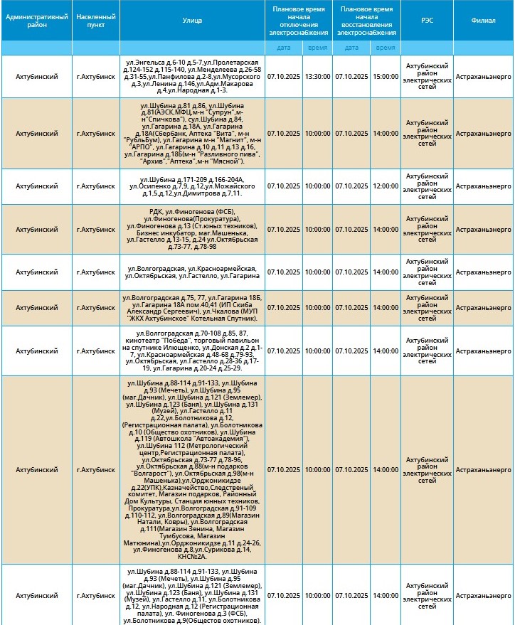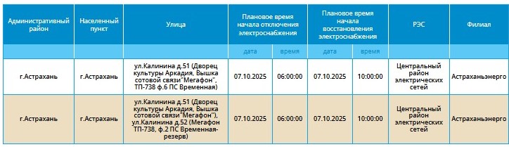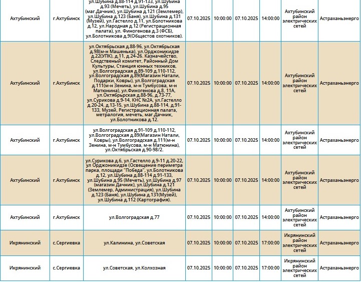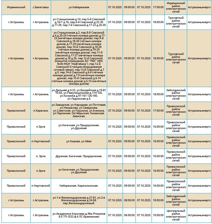Главный «удар» примет на себя город Ахтубинск. Электропауза в этом северном городе нашего региона наступит на нескольких десятках улиц. Также без электричества останется ряд адресов в Астрахани и восьми селах Приволжского и Икрянинского районов. Список представлен в таблице ниже.