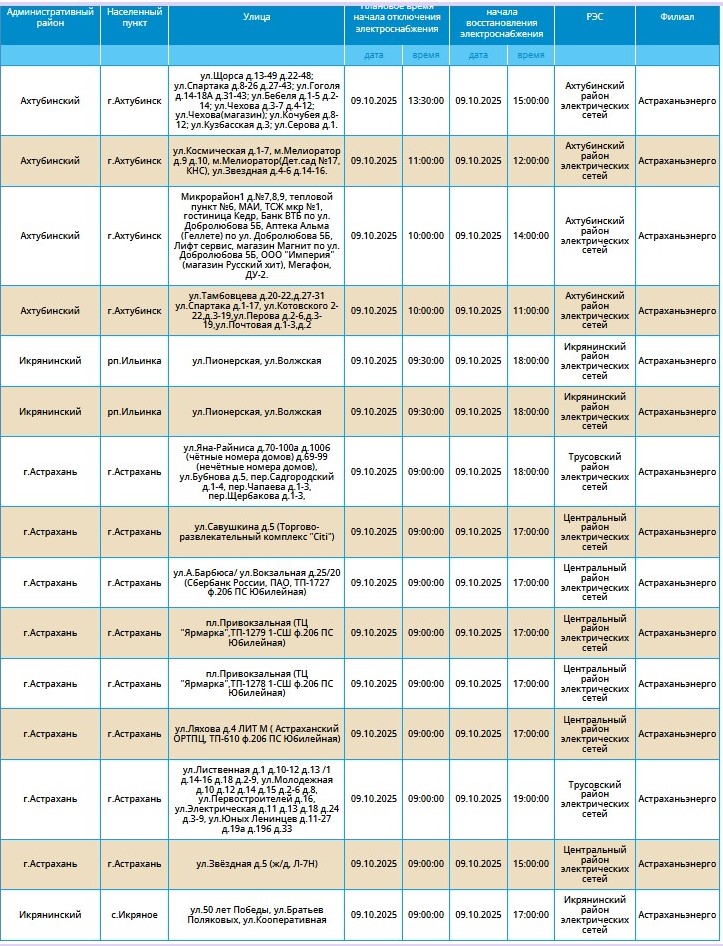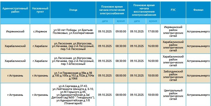 Массовые перебои в электроснабжении продолжатся и в четверг. 9 октября отключение света коснется нескольких населенных пунктов Астраханской области. Astrakhanpost.ru выяснил, какие из них попали в список «счастливчиков».