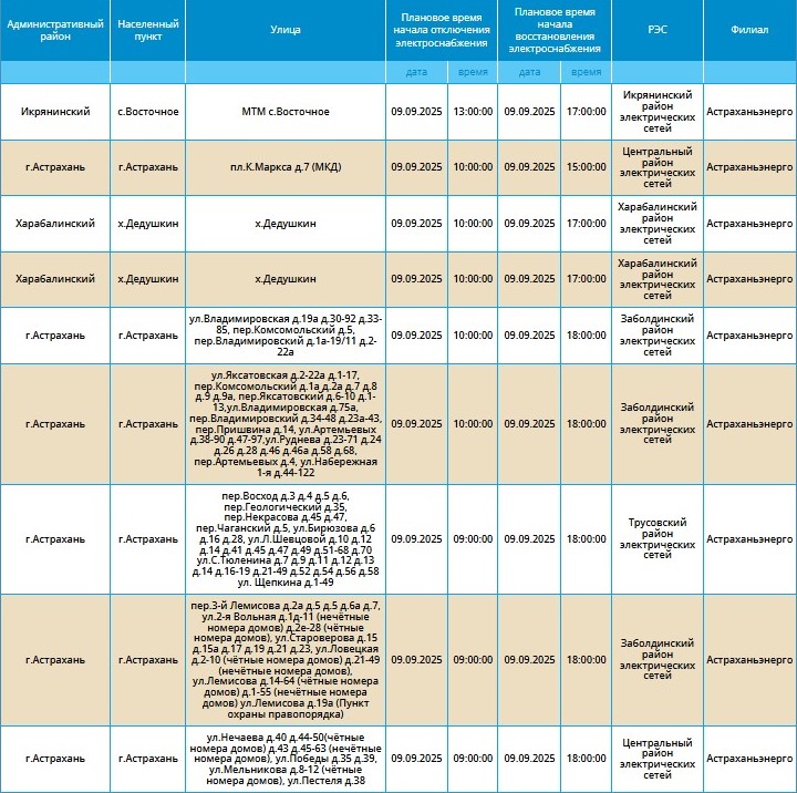 Массовые перебои в электроснабжении продолжатся и во вторник. 9 сентября отключат свет в ряде населенных пунктов Астраханской области.