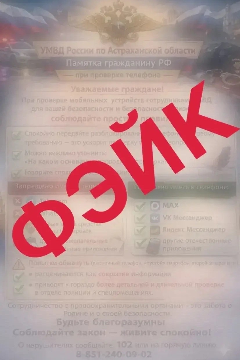 В мессенджерах 25 марта появилась фальшивая листовка с символикой УМВД России по Астраханской области. В тексте давались рекомендации по поводу того, что делать, если правоохранители потребуют показать телефон на предмет наличия разрешенных или запрещенных приложений.