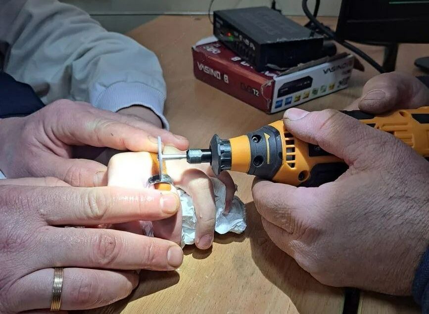 Осмотрев палец ребенка, спасатели определили способ своих дальнейших действий. Проложив между пальцем и украшением защитный материал, они распилили металлическое изделие при помощи слесарного инструмента. Таким образом освободили юного астраханца от мучений. Медицинская помощь мальчику не потребовалась.