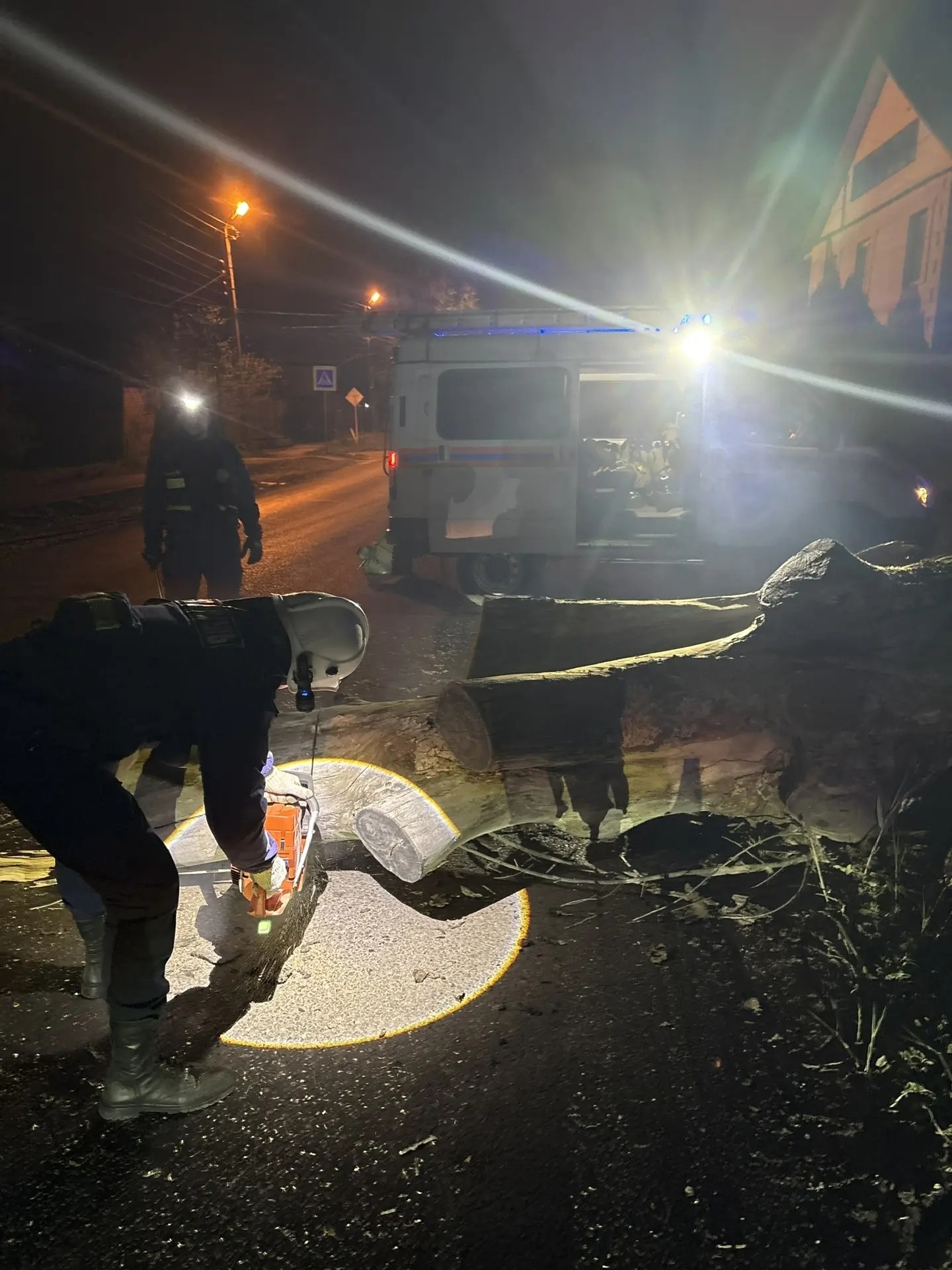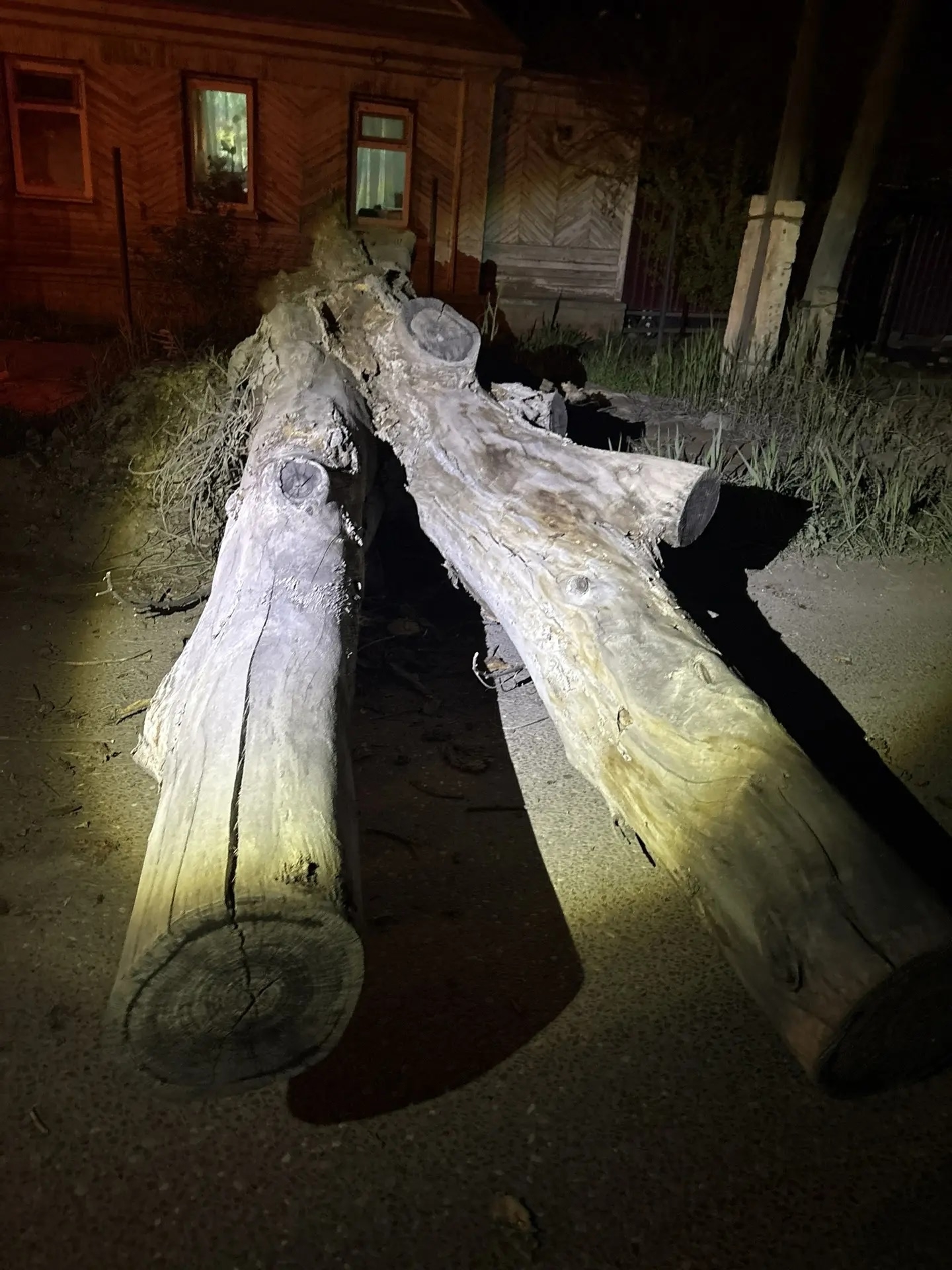 Городские спасатели Астрахани освободили улицу Краснопитерскую от упавшего дерева, которое полностью перекрыло движение транспорта.