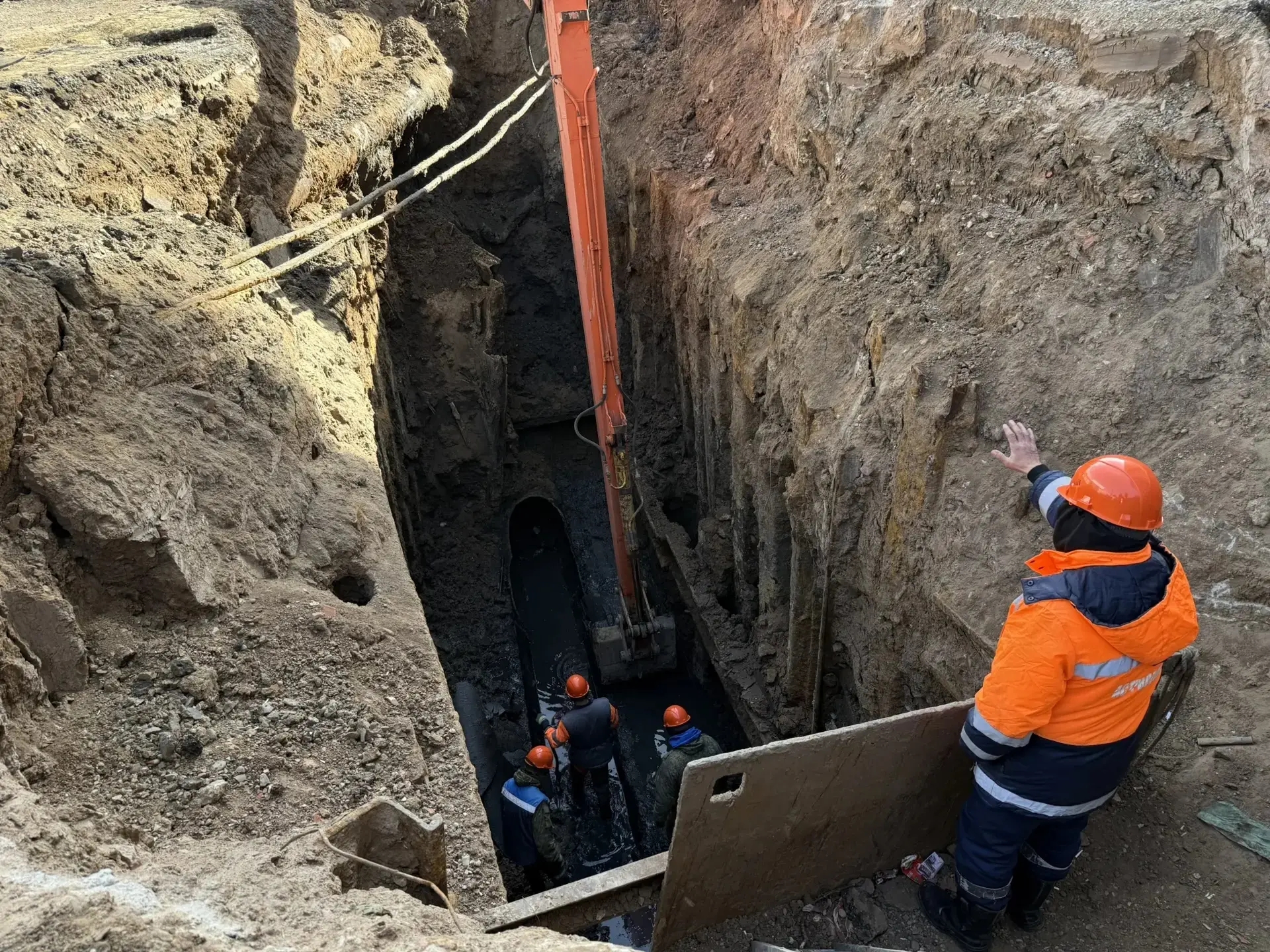 Добавим, что работы проводятся на отметках от семи до восьми метров. Именно на такой глубине пролегают основные сети. В процессе подготовки после вскрытия грунта для доступа к задвижкам специалисты выявили аварийное состояние самотечного трубопровода. Поэтому было решено заменить данный участок. Для подготовки котлованов используется экскаватор больших габаритов, а откосы траншей надежно укрепляются металлическим шпунтом, предотвращающим осыпание грунта.