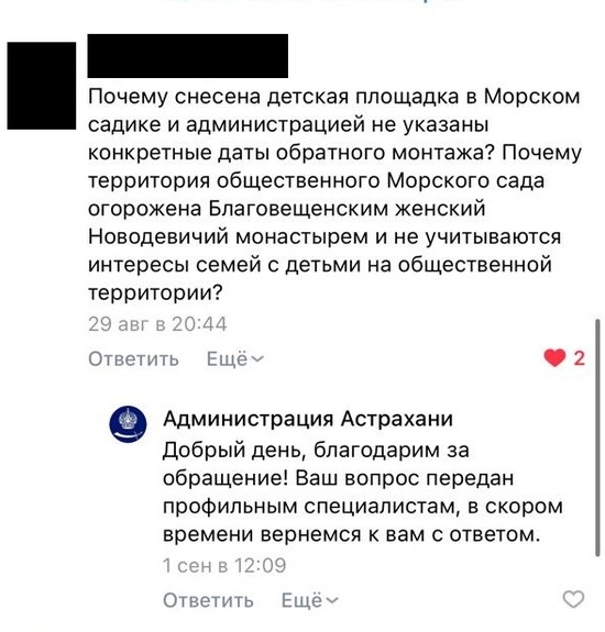 Астраханка рассказала и то, как в дальнейшем развивались события. Вместо обещанного монтажа новой площадки, территорию, где она располагалась, огородили железным забором. Женщина с удивлением обнаружила, что территория, включая место, где раньше играли дети, теперь якобы принадлежит Новодевичьему монастырю.