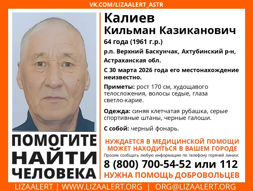 Астраханские добровольцы просят жителей региона помочь в розыске 64-летнего Кильмана Казикановича Калиева, который пропал в конце марта. Мужчина перестал выходить на связь 30 марта 2026 года в поселке Верхний Баскунчак Ахтубинского района. Астраханец среднего роста (170 см), худощав, имеет седые волосы и светло-карие глаза. Из важных деталей — пропавшему требуется медицинская помощь. В последний раз […]