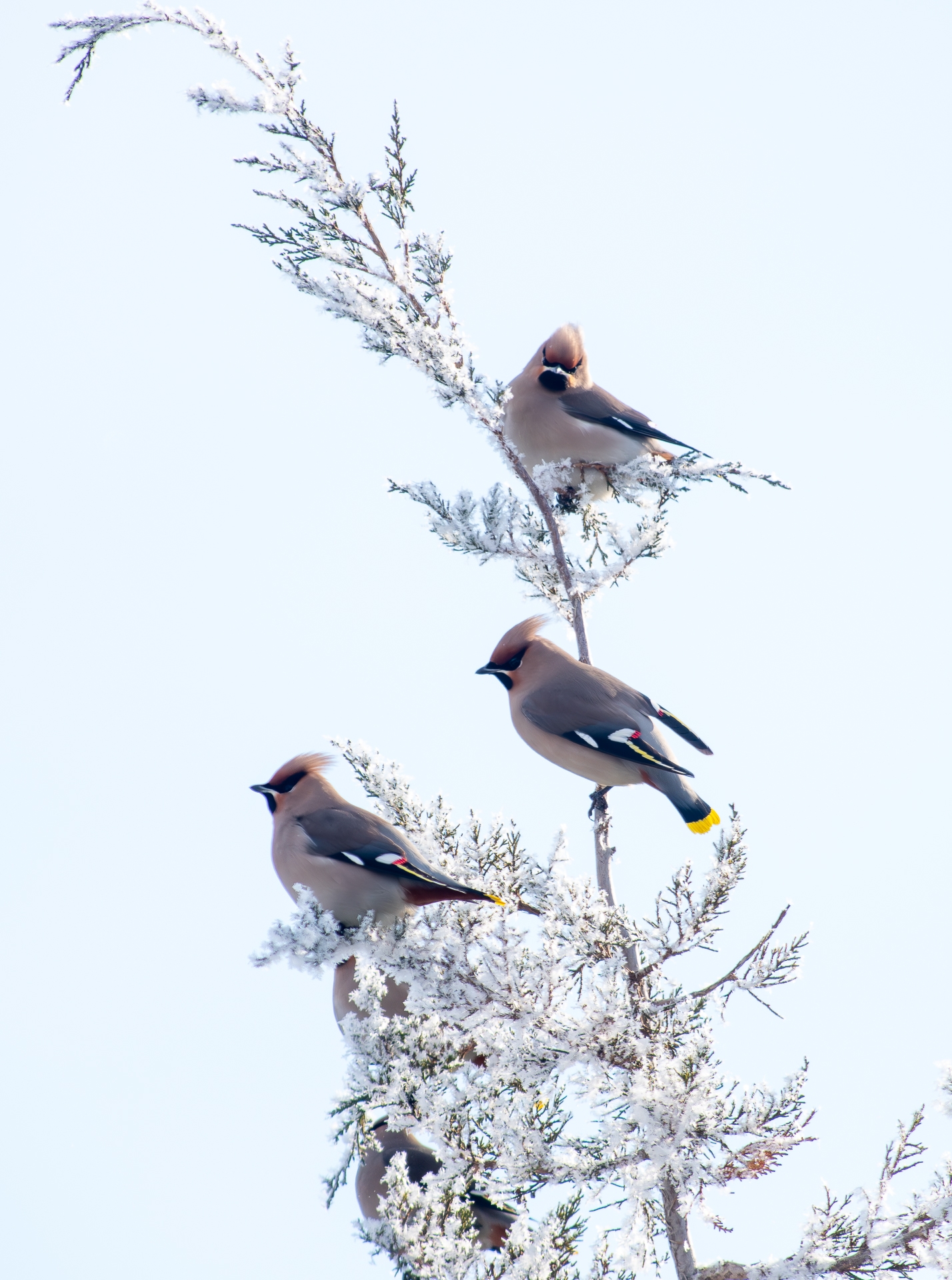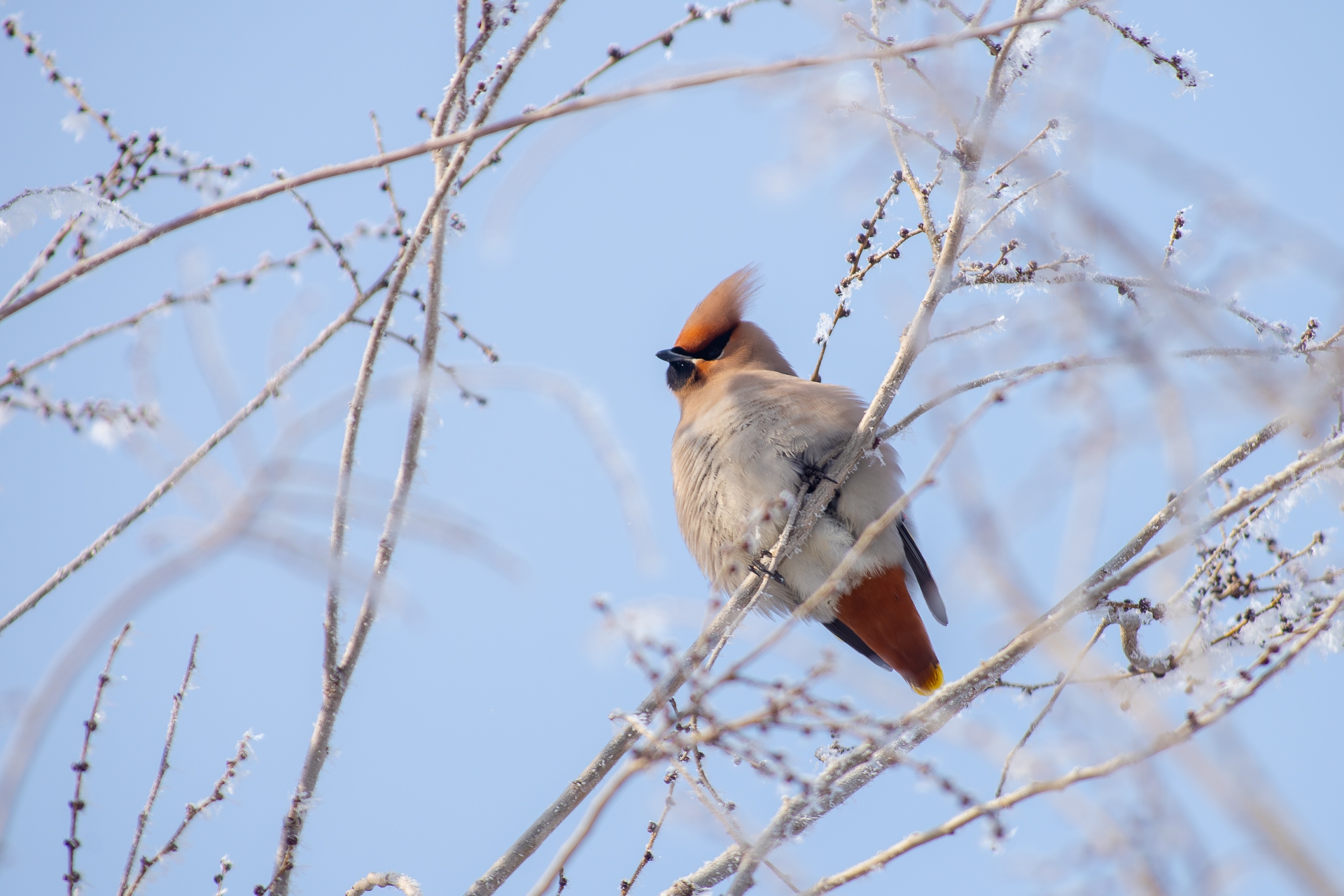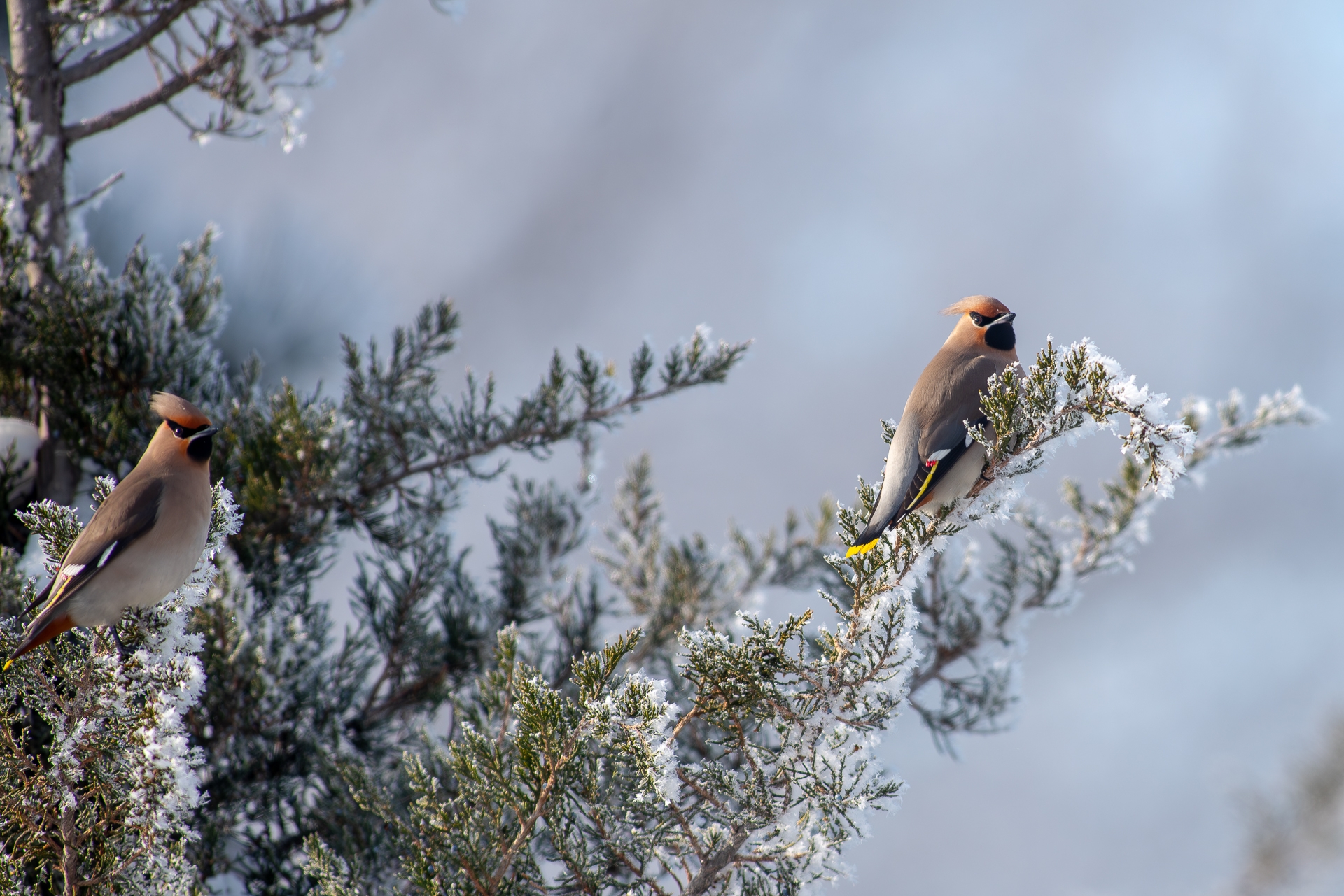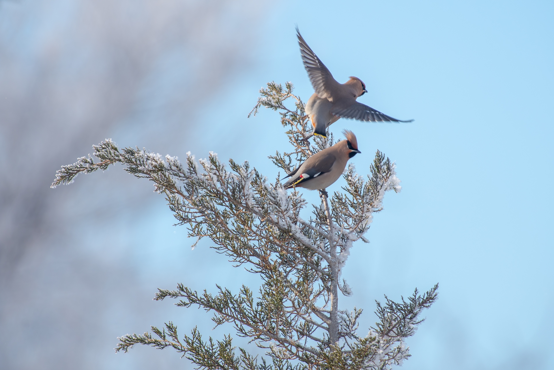 Днем ранее фотографу удалось поймать в объектив и других зимних гостей — неуловимых свиристелей. Как отмечает Владимир, эти птицы прилетают к нам каждую зиму, но сфотографировать их — настоящий квест. Свиристели постоянно кочуют, прячутся на верхушках деревьев и часто вступают в конфликты с дроздами. Особенно жарко становится у кустов можжевельника: дрозды ревностно охраняют ягоды и с криками прогоняют конкурентов.