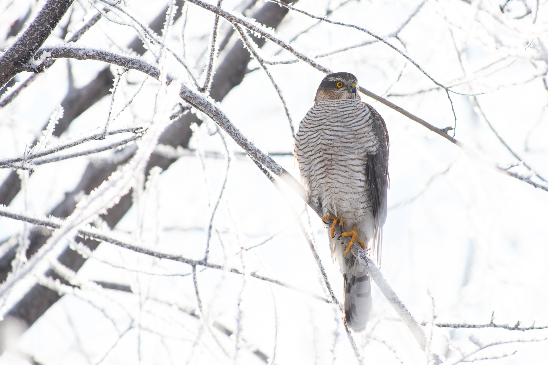 Главным героем последних снимков стал ястреб-перепелятник, который прилетел в кремль вслед за стаями дроздов и свиристелей. Жизнь у хищника не самая спокойная: иногда его пытаются прогнать наглые серые вороны, но чаще он сам устраивает охоту на птичью «мелочь», выслеживая добычу среди крепостных стен.