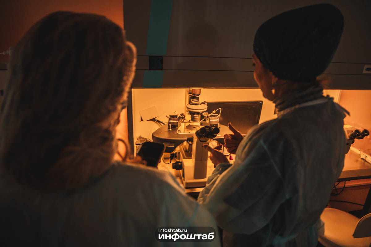 «Эмбрионы так же, как цыплята, вылупляются. Нам нужно следить, чтобы, когда он раскрывается из оболочки, его имплантировать. В этот момент он очень нежный становится, нужно быть очень аккуратными», — объясняет заведующая цитогенетической лабораторией Светлана Рипп.