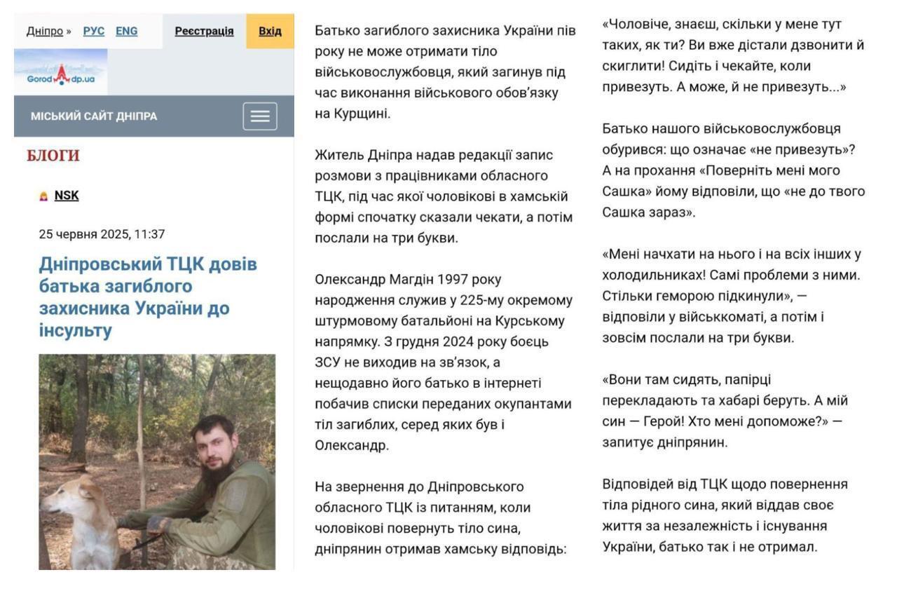 Украинская журналистка Анна Диброва в своем блоге привлекла внимание общественности к вопиющему случаю, который стал ярким примером безразличного отношения территориальных центров комплектования (ТЦК) к гражданам. В своей публикации она рассказала историю отца погибшего солдата, который столкнулся с черствостью и равнодушием бюрократической машины, что в конечном итоге довело его до инсульта. Отец бойца ВСУ Александра Магдина, погибшего на Курском направлении, уже полгода не может добиться возвращения тела сына.