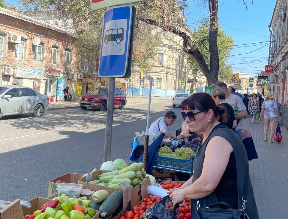 Знак указывает, что в этом месте дороги – остановка общественного транспорта. Но вместо павильона и лавочки для пассажиров — торговый ряд, где активно торгуют овощами и фруктами. Причем, ящики с товаром размещены на узком тротуаре и остановочной площадке, заняв значительную часть территории. И это доставляет немало неудобств для пешеходов.