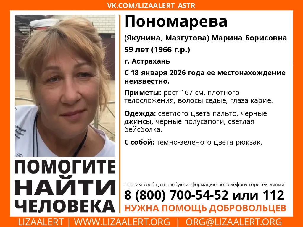 Марина Борисовна Пономарева, которой сейчас 59 лет, перестала выходить на связь, и к её поискам уже подключились волонтеры отряда «ЛизаАлерт». Близкие и добровольцы просят астраханцев внимательно присмотреться к прохожим, так как любая информация может помочь в установлении её судьбы.