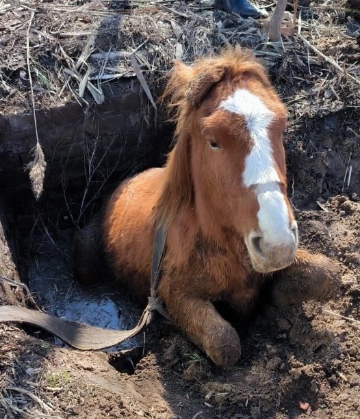 С помощью трактора кобылу удалось вытянуть на поверхность. Лошадь была настолько слаба, что не сразу смогла вскочить на ноги.