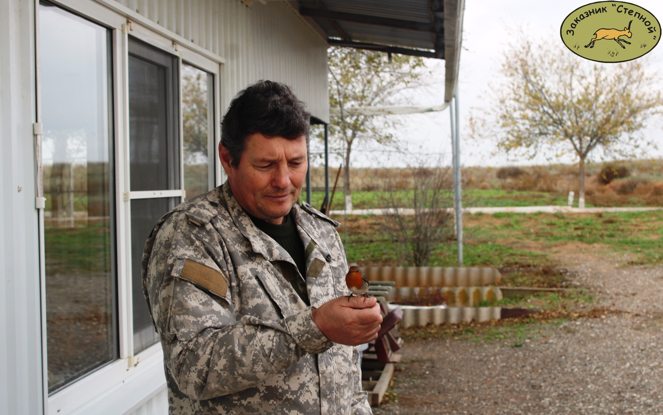 Раннее утро в Астраханском заказнике «Степной» выдалось по-настоящему сказочным. Когда инспектор вышел прогреть служебный автомобиль перед охранным объездом, на его руку неожиданно опустилась зарянка — словно в сцене из старого мультфильма, где птицы слетаются на зов Белоснежки.