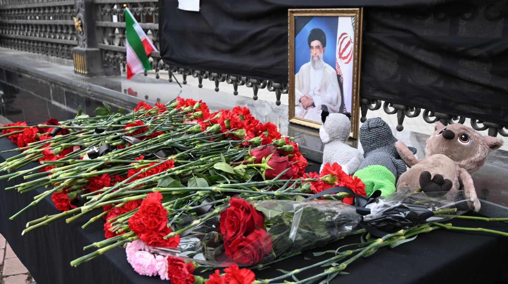 В знак траура флаг, установленный на здании диппредставительства, спущен. На стене на чёрном фоне — портрет верховного лидера Ирана аятоллы Сейеда Али Хаменеи, погибшего в результате авиаудара в минувшую субботу в Тегеране.